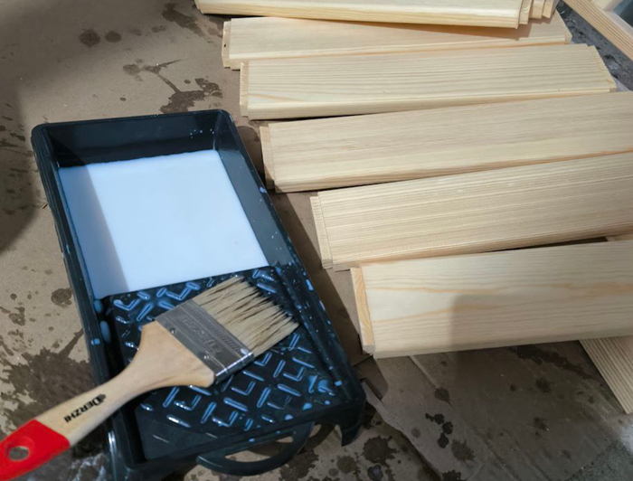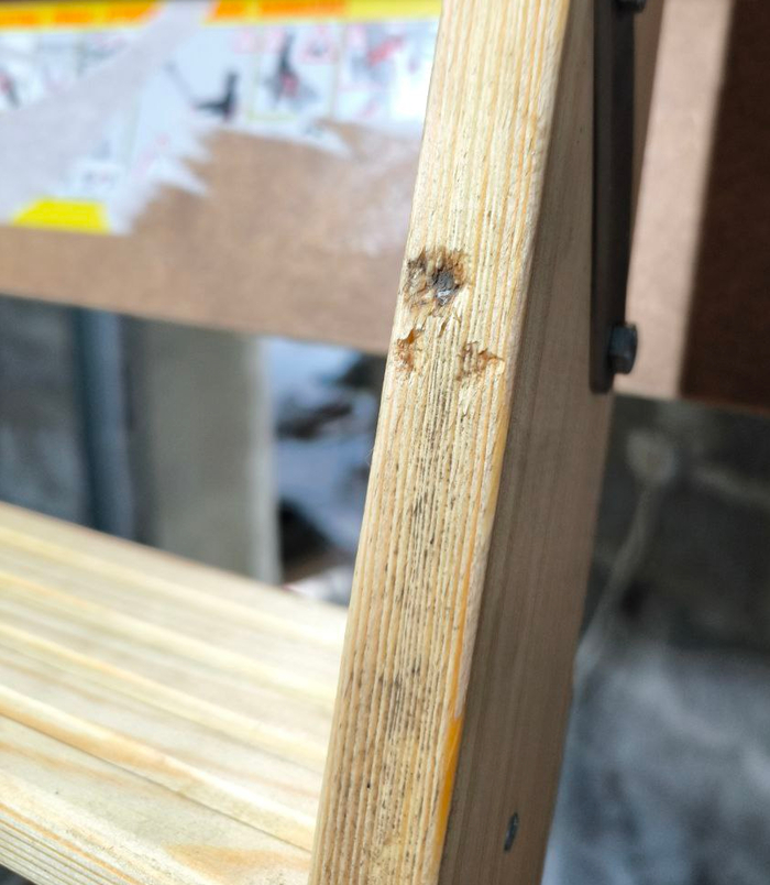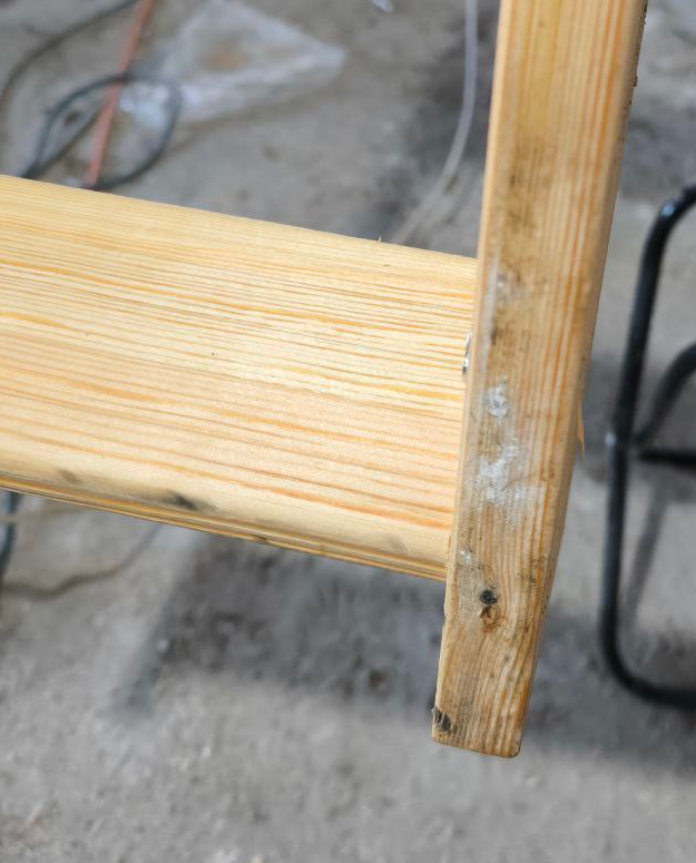 Следующий этап - сбор лестницы. Одна лестница идет в сборе, а еще две нужно собрать. Это мне не понравилось больше всего. Ступени входят в боковины туго, что хорошо, но на столько туго, что приходилось использовать большую силу, чтобы их вбить. Кое где пришлось ножом подрезать. Естественно я использовал промежуточный брусок, но повредил обратную сторону лестницы, так как пол у меня не чистовой и кое-где попадались камни. Но это моя проблема, как рукожопа. На фото видно что испортил.