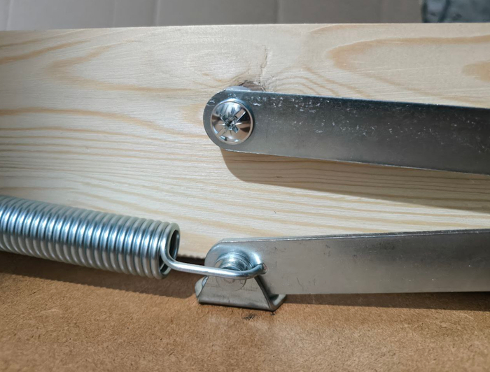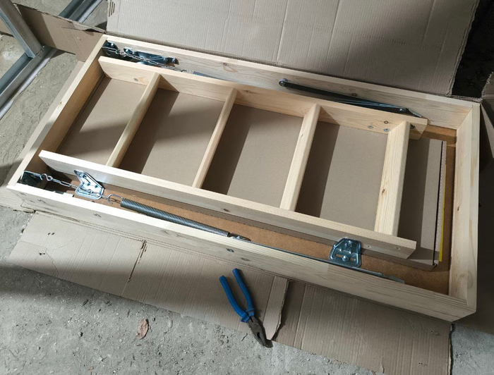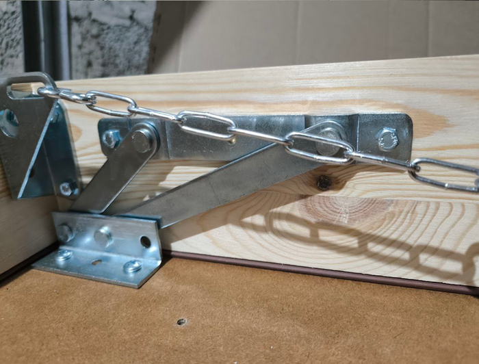 В результате были сделаны доборы, по длинным сторонам, который на себя примут основной вес короба и лестницы. Один добор крепится к лаге винтом для дерева с шестигранной головкой и шайбой, он на переднем плане. Второй добор крепится к двум доскам, которые располагаются сверху и снизу чернового пола (не догадался сфотографировать). Короб крепится тремя винтами с каждой длинной стороны к доборам (на фото еще не видно) и двумя винтами к черновым доскам по короткой стороне (на предыдущей фото слева видно). В заключении я повис на руках на инсталляции и покачался. Дерево даже не скрипнуло.