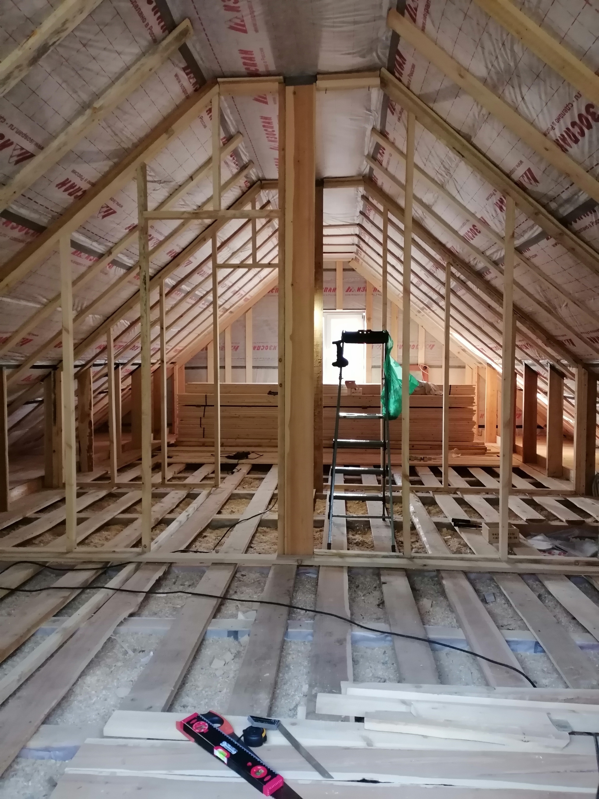 Здесь я совершил стратегическую ошибку: затащил наверх все 160 м² (это дохера, и даже выше стопка получилась) вагонки (ель, 2-й сорт) сразу. Потом её пришлось пять раз перекладывать с места на место, т.к. нужно было делать перегородки. Их я сколотил из бруска 40*50*4000