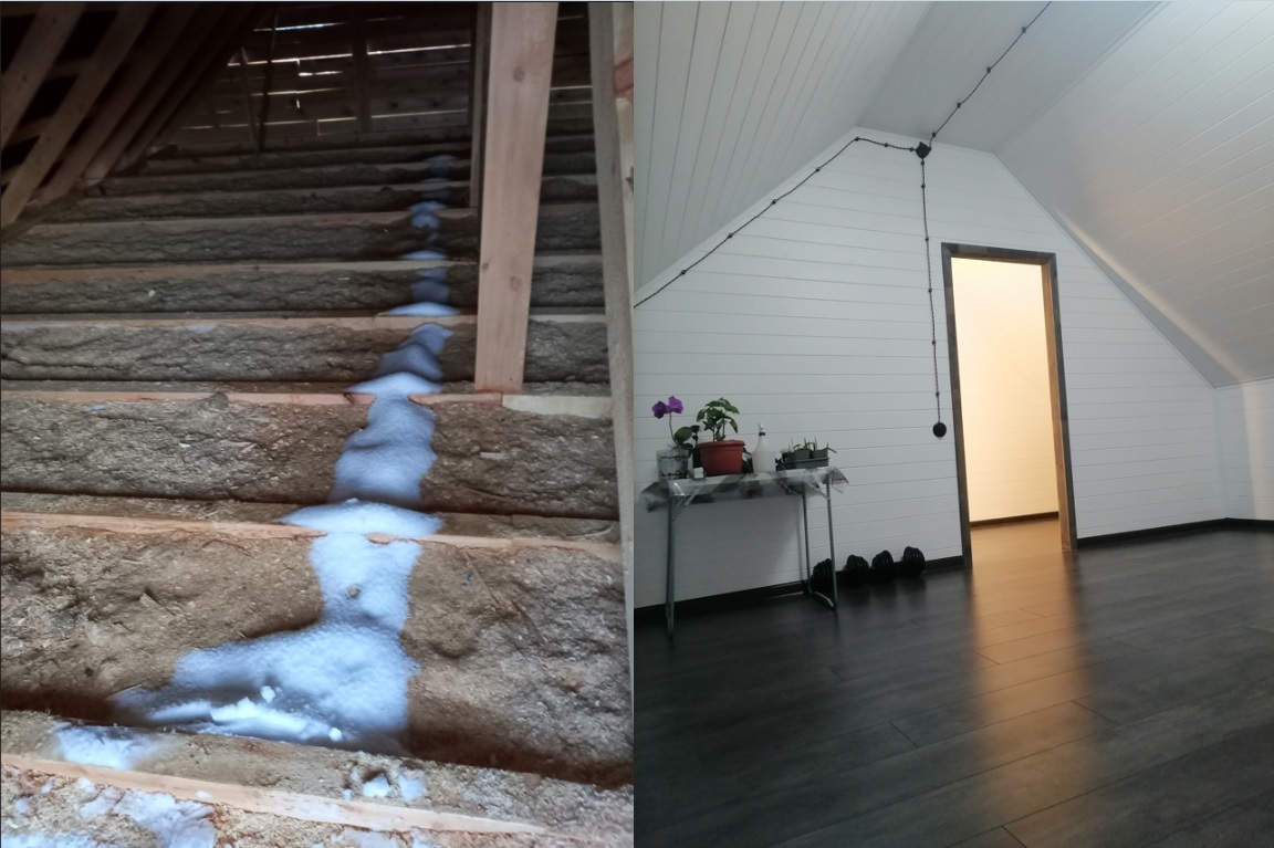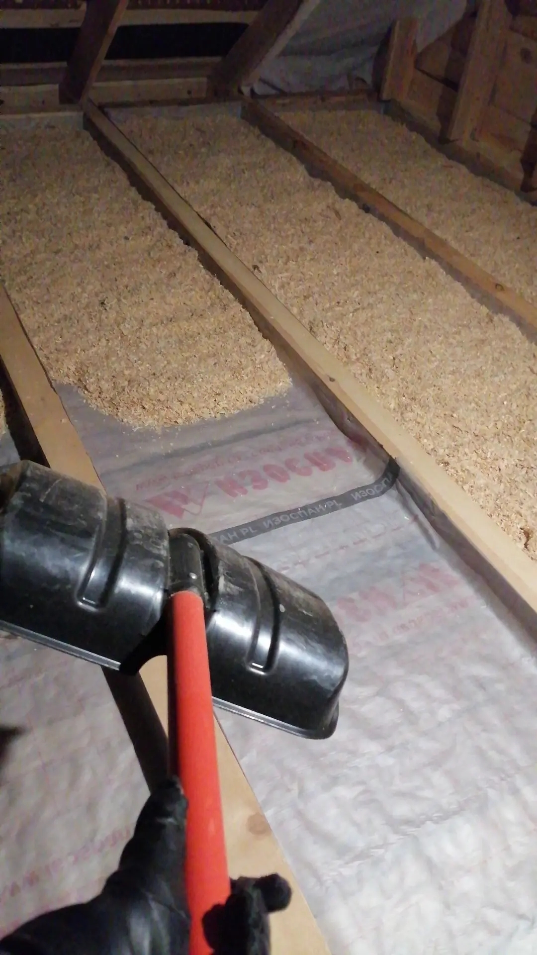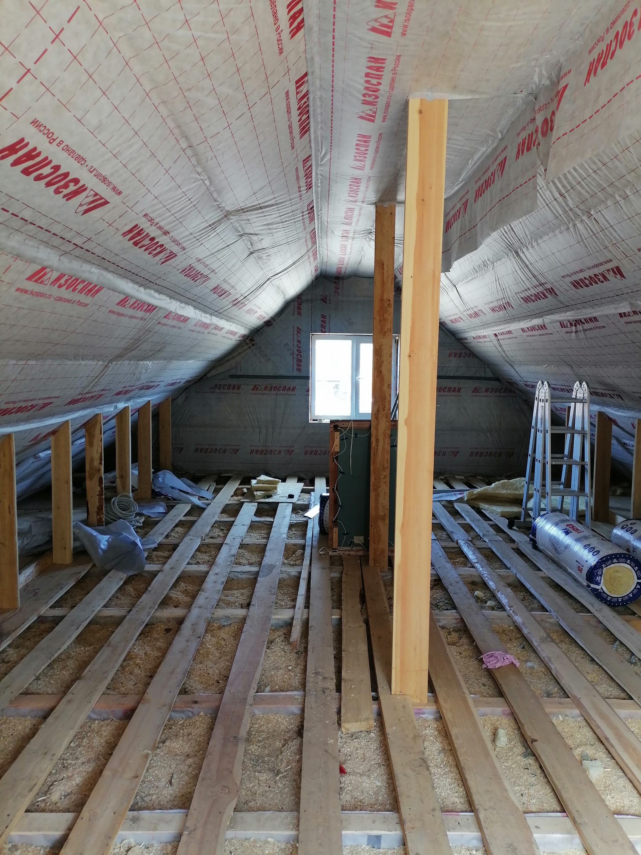 Начали мы с супругой с того, что убрали все опилки с крыши, постелили новую пароизоляцию между лаг потолка. Что там было до этого, лучше не видеть вовсе. Застройщик просто с закрытыми глазами накидал на черновой пол дырявых кусков ветрозащиты и пароизоляции, видимо обрезки которые оставались. Естественно через эту невеликую защиту на натяжной потолок сквозь щели меж досок чернового потолка сыпались опилки, и к тому моменту, когда мы с женой принялись разбирать это дело, там всё было завалено тонким слоем. Так что пришлось ещё и разбирать черновой потолок, пылесосить и протирать натяжной потолок.