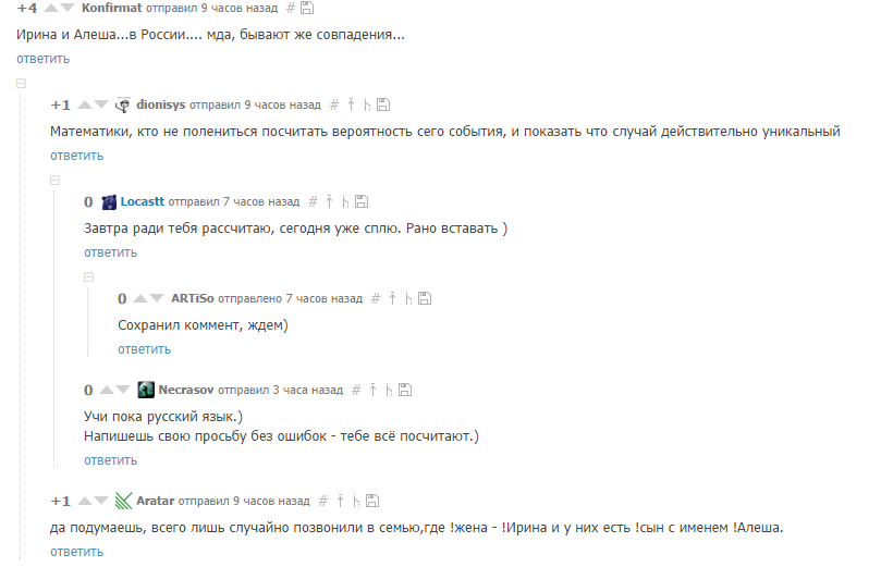 На первый взгляд, появляется мысль, что в этом нет ничего необычного. Действительно, мало ли в России Ирин да Алексеев. И пользователь @Konfirmat резонно обратил на это внимание.