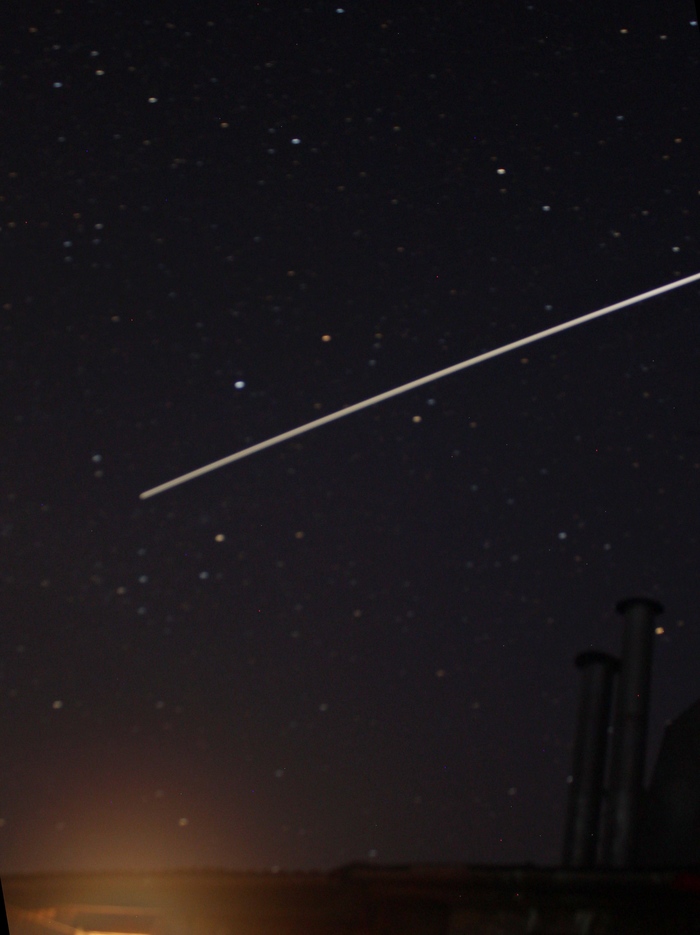 По небу вызывающе двигалась яркая белая точка, однозначно идентифицируемая по присланным ранее постам друзей с временами пролётов МКС. Если что-то видно, то это можно сфотографировать, вопрос только — как? Гуглинг привёл к тому, что МКС нужно сопровождать вручную, наблюдая через искатель телескопа и снимать на видео. Астрокамеры (web-камера, заточенная под астросъёмки) у меня не было, на Canon я особо не надеялся, да и идея сопровождать, не имея опыта, точку, быстро плывущую по небу, показалась весьма прохладной. Так что задумка заглохла до лучших времён, оставив как напоминание о себе этот мутный снимок МКС, пролетающей над крышей дома: