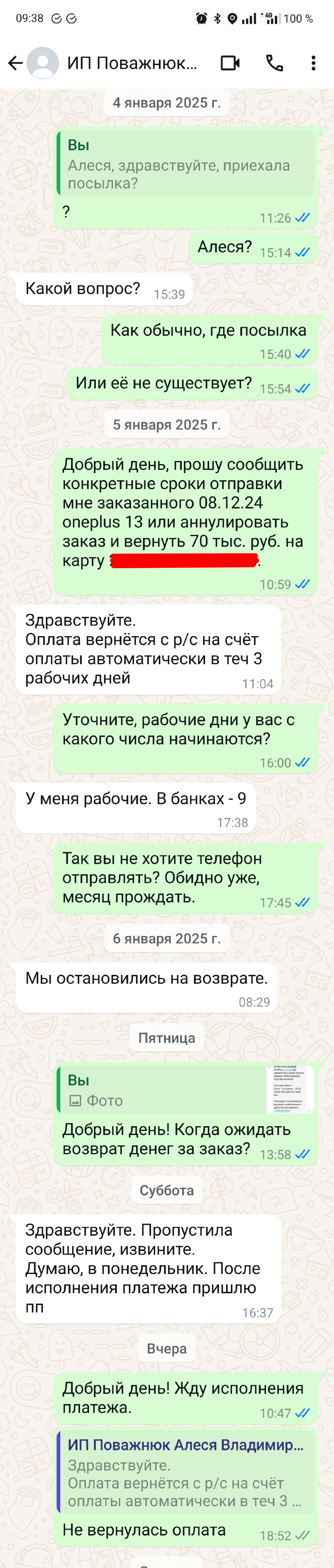 23.01 я поехал в ОВД писать заявление о мошенничестве, предварительно предупредив об этом ИП Поважнюк А.В., и о чудо! Пришел возврат платежа!!