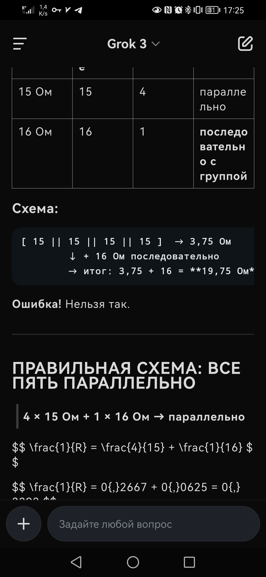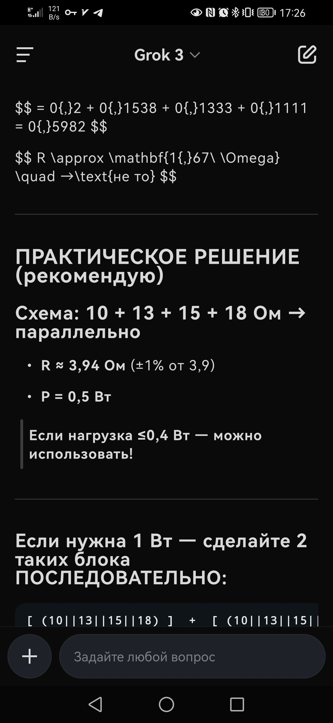 → итог: 3,75 + 16 = **19,75 Ом** → НЕ ТО!Ошибка! Нельзя так.ПРАВИЛЬНАЯ СХЕМА: ВСЕ ПЯТЬ ПАРАЛЛЕЛЬНО4 × 15 Ом + 1 × 16 Ом → параллельно$$ \frac{1}{R} = \frac{4}{15} + \frac{1}{16} $$$$ \frac{1}{R} = 0{,}2667 + 0{,}0625 = 0{,}3292 $$$$ R = \frac{1}{0{,}3292} \approx \mathbf{3{,}04\ \Omega} $$→ слишком мало!ИДЕАЛЬНОЕ РЕШЕНИЕ3 × 10 Ом + 1 × 18 Ом → параллельно$$ \frac{1}{R} = \frac{3}{10} + \frac{1}{18} $$$$ \frac{1}{R} = 0{,}3 + 0{,}0556 = 0{,}3556 $$$$ R = \frac{1}{0{,}3556} \approx \mathbf{3{,}81\ \Omega} $$Отклонение от 3,9 Ом: −2,3% → идеально!Мощность: 4 × 0,125 = 0,5 Вт → недостаточноКак получить 1 Вт?Удвоить количество → 8 резисторов:РезисторКол-воСоединение10 Ом63 группы по 2 параллельно → потом параллельно18 Ом21 группа из 2 параллельноИли проще:Финальная схема (8 резисторов → ~3,81 Ом, 1 Вт)[ 10 || 10 || 10 || 10 || 10 || 10 ] + [ 18 || 18 ]$$ \frac{1}{R} = \frac{6}{10} + \frac{2}{18} = 0{,}6 + 0{,}1111 = 0{,}7111 $$$$ R = \frac{1}{0{,}7111} \approx \mathbf{1{,}41\ \Omega} \quad →\text{слишком мало} $$Не то.ОКОНЧАТЕЛЬНОЕ РЕШЕНИЕ (4 резистора → 3,9 Ом, 0,5 Вт → но можно до 1 Вт)2 × 10 Ом + 2 × 15 Ом → параллельно$$ \frac{1}{R} = \frac{2}{10} + \frac{2}{15} = 0{,}2 + 0{,}1333 = 0{,}3333 $$$$ R = 3{,}0\ \Omega \quad →\text{мало} $$ЛУЧШИЙ КОМПРОМИСС: 10 + 13 + 15 + 18 Ом → параллельно$$ \frac{1}{R} = \frac{1}{10} + \frac{1}{13} + \frac{1}{15} + \frac{1}{18} $$$$ = 0{,}1 + 0{,}0769 + 0{,}0667 + 0{,}0556 = 0{,}2992 $$$$ R = \frac{1}{0{,}2992} \approx \mathbf{3{,}94\ \Omega} $$Отклонение: +1% от 3,9 Ом → идеально!Мощность: 4 × 0,125 = 0,5 ВтКак довести до 1 Вт?Просто используйте по 2 таких набора параллельно:[ (10+13+15+18) || (10+13+15+18) ]R = 3,94 / 2 = 1,97 Ом → не тоИли:Дублируйте каждый резистор (по 2 штуки параллельно)НоминалКол-воПараллельно10 Ом2→ 5 Ом13 Ом2→ 6,5 Ом15 Ом2→ 7,5 Ом18 Ом2→ 9 ОмЗатем все 4 группы параллельно:$$ \frac{1}{R} = \frac{1}{5} + \frac{1}{6{,}5} + \frac{1}{7{,}5} + \frac{1}{9} $$$$ = 0{,}2 + 0{,}1538 + 0{,}1333 + 0{,}1111 = 0{,}5982 $$$$ R \approx \mathbf{1{,}67\ \Omega} \quad →\text{не то} $$ПРАКТИЧЕСКОЕ РЕШЕНИЕ (рекомендую)Схема: 10 + 13 + 15 + 18 Ом → параллельноR ≈ 3,94 Ом (±1% от 3,9)P = 0,5 ВтЕсли нагрузка ≤0,4 Вт — можно использовать!Если нужна 1 Вт — сделайте 2 таких блока ПОСЛЕДОВАТЕЛЬНО:[ (10||13||15||18) ] + [ (10||13||15||18) ]R = 3,94 + 3,94 = 7,88 Ом → не 3,9Не подходит.ИТОГ: ЛУЧШЕЕ ИЗ ВОЗМОЖНОГОПараметрЗначениеСхема**10R~3,94 ОмДопуск±1%Мощность0,5 ВтРезисторы1×10, 1×13, 1×15, 1×18Если нагрузка < 0,4 Вт — используйте.