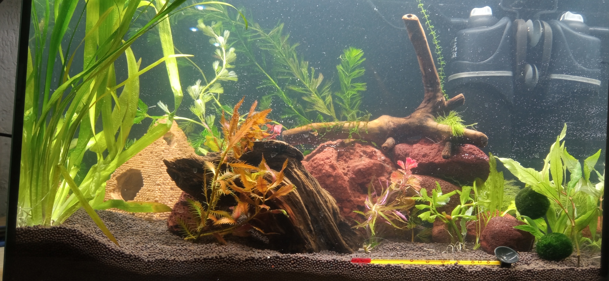 Месяц я не подходила к аквариуму. Итак что случилось за месяц, перегорела лампочка Ильича, сдохли все кроме гурамок, вода превратилась в зелёное болото. Мне стало жалко рыбок я начала читать различные статьи, не все статьи конечно оказывается надо читать. Попутно не особо вникая во всю суть аквариумаристики, сходила в магазин, там мне сказали надо сделать перезапуск, купив у них специальные бактерии, ну и ещё купить хороший светильник барбус. Что и было сделано. Ещё наверное через месяц, я решила что 2 рыбы это мало и купила "неприхотливого" петушка и двух петушек ему. Был куплен внутренний фильтр акваэль мощность 260 л/ч. Был куплен Анубис и примотан к коряге которую я варила и тушила, на сетку примотан мох, к камням привязана элодея, закреплён большой пучок роголистник, на поверхности воды отправлены шарики ричии. Анубиас, мох по итогу не прижился, остальное всё зер гуд. Петушка в итоге одна оказалась петушком и замачила старшего петушка, а вторая петушка с горя повесилась на леске. Оставшийся петух дожил до момента пока мы кондёр забыли включенным на сутки 16 градусов выставленным. Вообщем больше рыб я не заводила так и живут на протяжении полутора года 2 гурамки, а ну ещё 2 неретины зебры и одна вишня креветка но я её давно не видела что то.