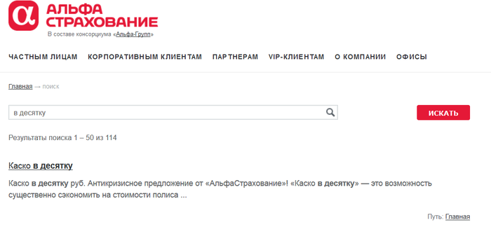 Таки да, "КАСКО в десятку" действительно можно оформить! И под условия я подхожу, и звёздочек и сносок опять же нет. Но вот где его найти на сайте?.. Вбиваю в поиск "в десятку" и получаю нужную мне ссылку:
