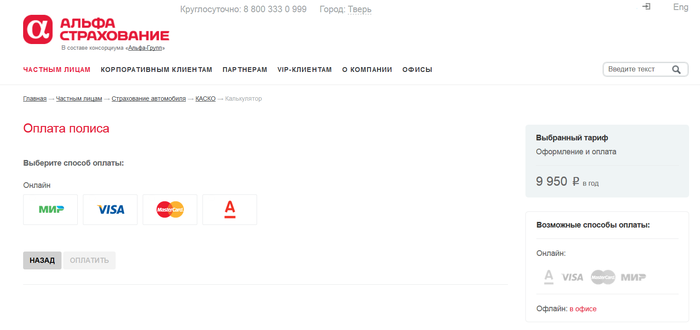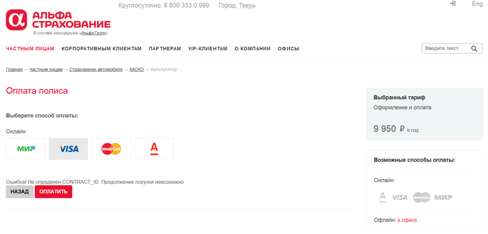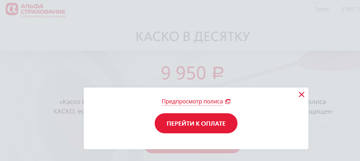 Круто, я почти у цели! Если сейчас оплачу, то потом, если что, есть шанс заставить страховую выдать-таки мне данный полис КАСКО, раз я за него уже заплатил. Щёлкаю на оплату и...
