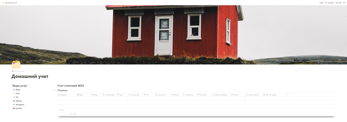Из нюансов стоит отметить что страница Домашний учет содержит в себе базу данных Платежи и страницы (которые являются также базами данных) услуг. Базы услуг выглядят идентично за исключением того, что например в базе Мусор отсутствуют поля "Текущие" и "Предыдущие значения" поскольку они там ни к чему, а количество кубов из формулы переделано в цифровое поле, где я указываю за сколько месяцев произведена оплата. В базе интернет отсутствует поле для платежки, поскольку там нужна только копия чека ведь оплата происходит в онлайне. В базе септик отсутствуют поля количества.