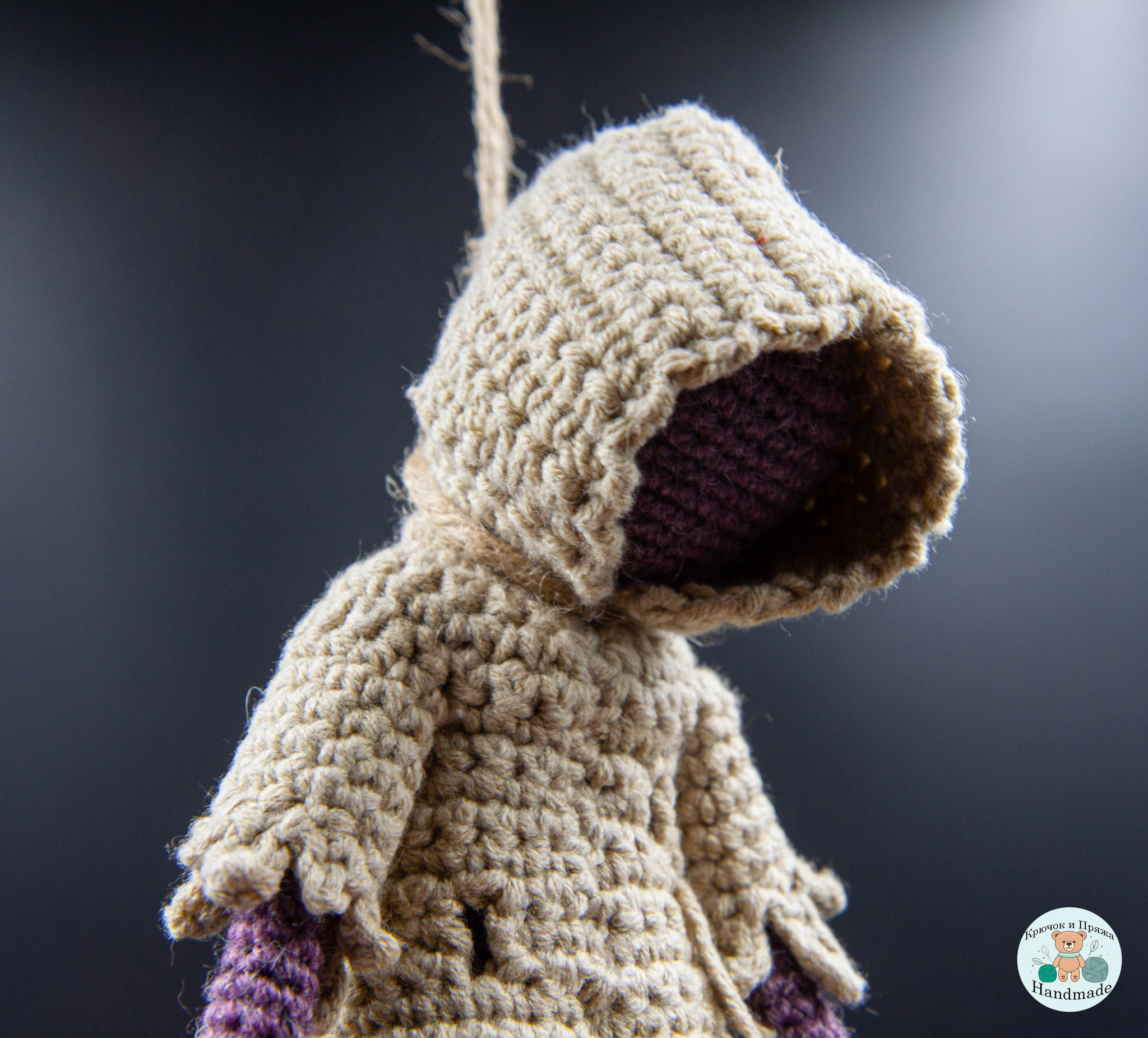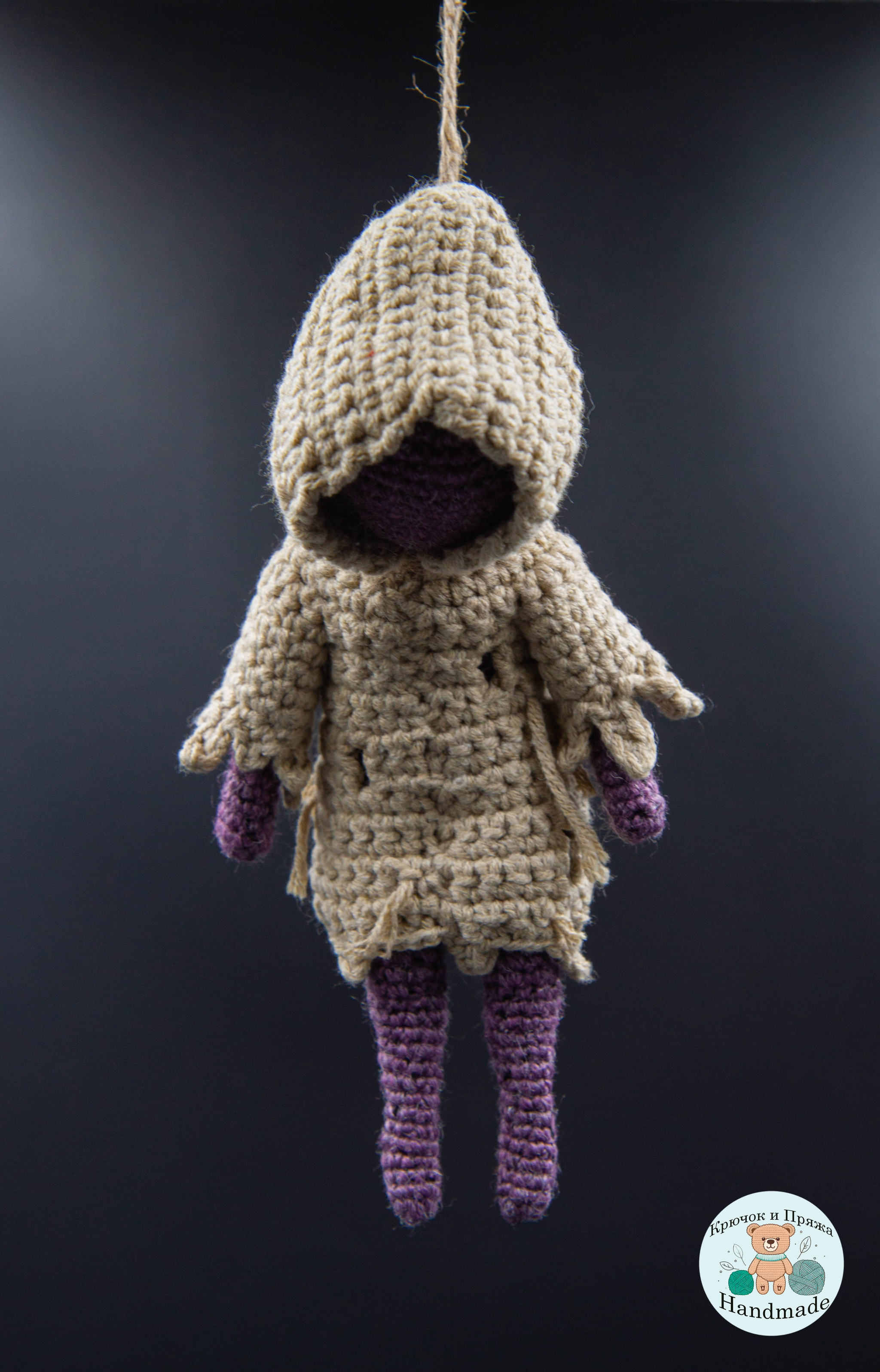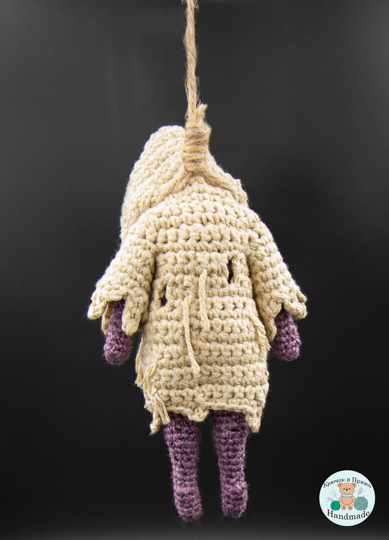 Отчаяние, отрицание, смирение. Глаза боятся, руки - тоже! Получилось далеко не с первого раза. Не сразу нашлась подходящая веревка для петли. Потом пришла идея сделать оборванные нити на балахоне, дырки, а также вплести в тело черную пряжу для правдоподобия.