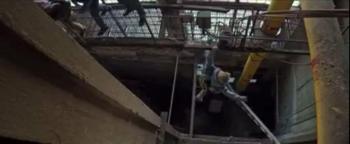 Постановщик трюков Вячеслав Аникин сдергивал лестницу, а я хватался одной рукой и повисал. Риггеры должны были дать мне возможность это сделать самому, то есть подхватить меня уже после зацепа, что не так просто, как может показаться. В одном из дублей (в данном случае в последнем) можно увидеть, как веревка от лестницы накрутилась на моем запястье, и я в некоторой степени повис и на этой руке тоже. Если бы риггеры не поддержали, мог бы и серьезную травму получить, потому что такая веревка при срыве вниз может руку повредить (если не оторвать).