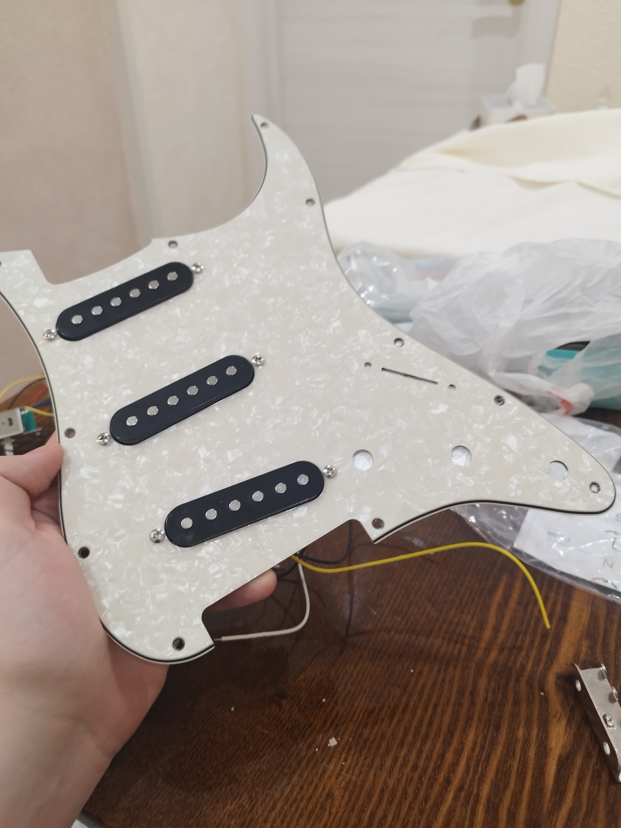 После этого — пайка и монтаж всей электроники: звукосниматели, потенциометры, переключатель, джек — всё заново. Установил новый пикгард.)))