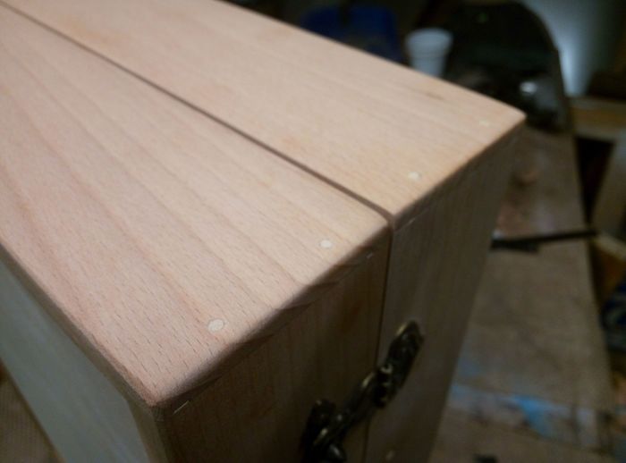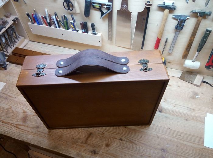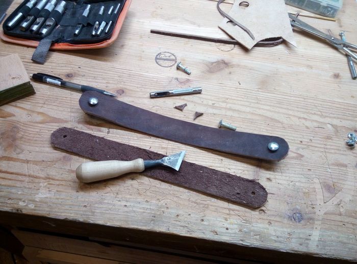 У меня была проблема с ручками. Никак не прикрутить их было посередине ящика, т.к. как раз по краю обоих половинок идет паз под крышки, а если развести ручки дальше, то не ухватиться. Поэтому было решено сделать ручки из кожи. Очень удобно получилось.