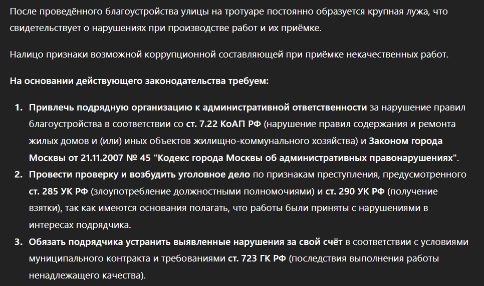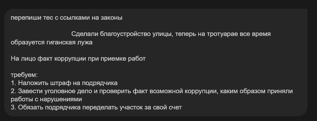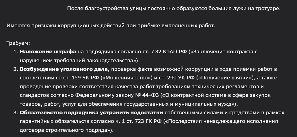 Это конечно не ИИ, а просто текст. Хотелось чтобы я прикладывал фотку, ИИ определял проблему, определял ответственного, сам отсылал жалобы, сам долбил чиновников чтобы они ее качественно устраняли - вот это был бы сервис от Яндекс!