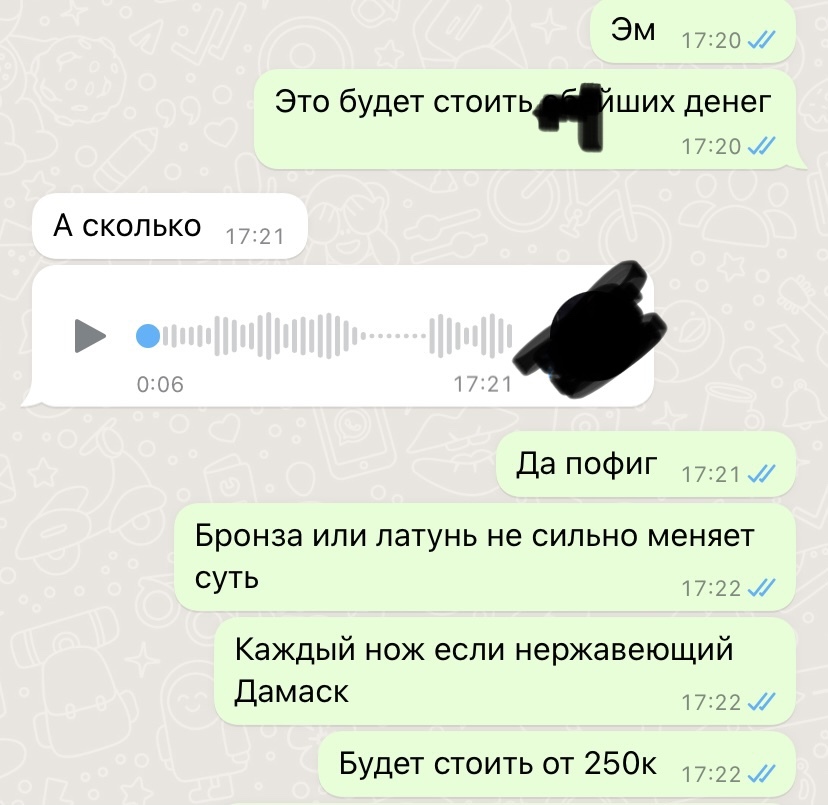 Тут он притих. Долго молчит и отвевает аудио, что то вроде «та ты угораешь?) ну не могут ножи столько стоить) это же не золото)»