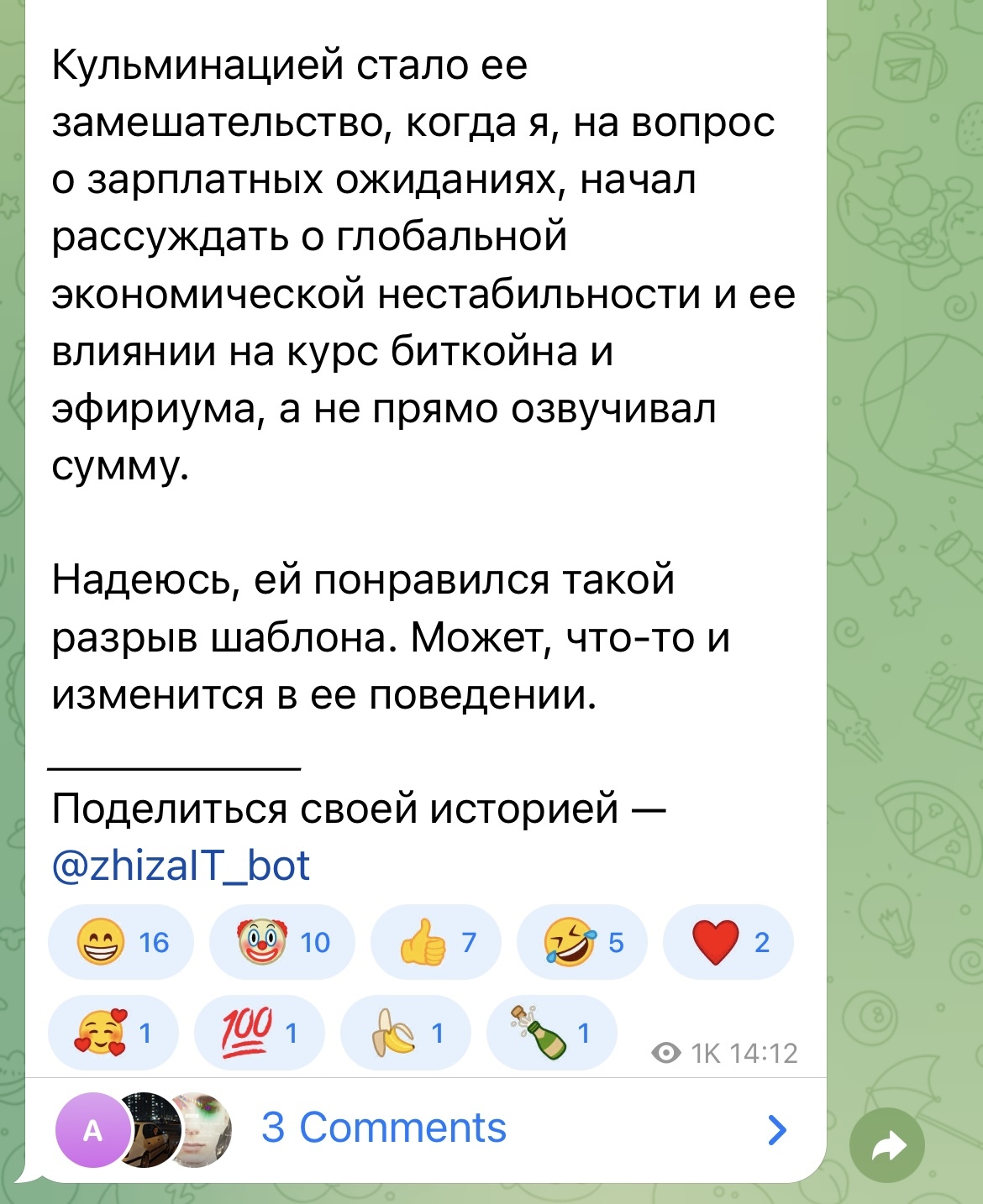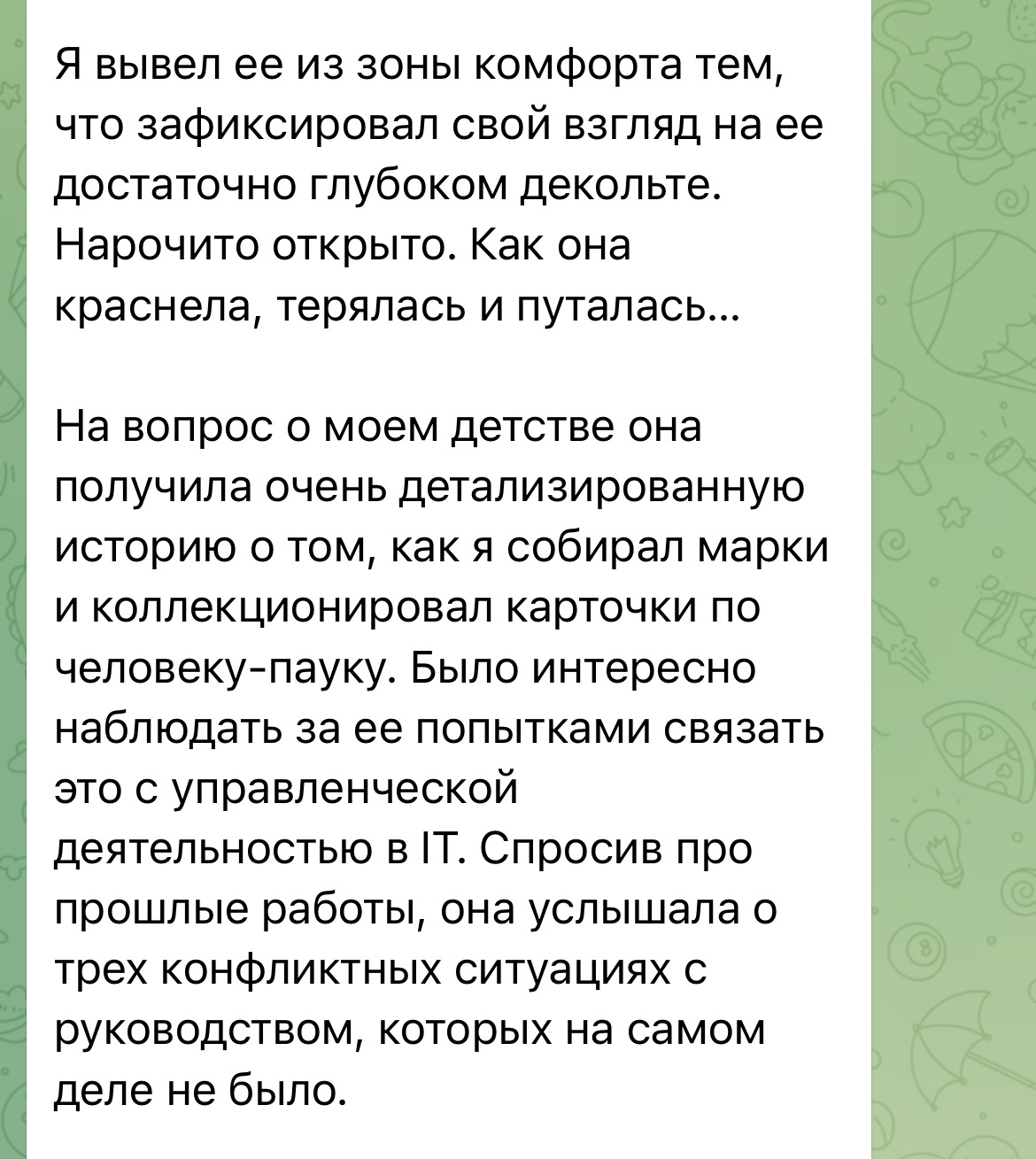 12 zhizait Как я поиздевался над эйчаром 1 год назад Источник: «Жиза ИТ руководителя» IT Работа Отдел кадров Работа HR Собеседование Менеджер Странный юмор Telegram (ссылка) Длиннопост Ещё 0