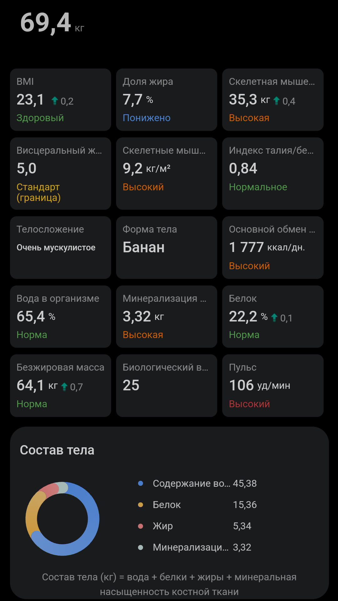 В октябре 2023 года убрал полностью все рафинированные продукты из рациона (мука, сахар, рис, картофель) – все под строгим запретом. Молочка – это враг худеющих, гуглите инсулиновый индекс, он важнее гликемического. Груб говоря стакан кефира вызывает сильнейший выброс инсулина и похудение останавливается. Молочку типа кефира и творога я употреблял только после силовой тренировки, как раз чтобы инсулин и повысить, нужно для роста мышечной массы. Далее составил список продуктов, который обязательно необходим: красная рыба, да и любая рыба, мясо (любое), руккола, да и любая зелень, овощи (болгарский перец, огурцы, помидоры, лук, сельдерей и т.д.), орехи (немного), обязательно печень трески, яйца. Добавил спортпит – БЦAA, ЕАА, Л-карнитин, предтрены, бустеры тестостерона, витамины и прочее прочее. Покупал много и не жалея денег. Вот тут я остановлюсь – считаю, что спортпит ну максимум дает еще +5%, но мне с ним было легче, когда уже накачаешь себя предтренами, хочешь не хочешь, на тренировку надо идти. Купил хороший велосипед, спин-байк, поставил турник-рукоход, брусья, скамью, разборные гантели, TRX петли и прочее. Начал заниматься сначала дома, благо площадь квартиры теперь позволяла сделать мини-зал в одной из комнат. Вес стал уходить довольно быстро, но в январе 2024 года я заболеваю сначала ковидом, потом осложнения в виде синусита, потом пневмония. Болел я до конца февраля. А до мая пытался прийти в себя. Тренировок почти не было, но и не жрал. С мая 2024 года стал упорно тренироваться.