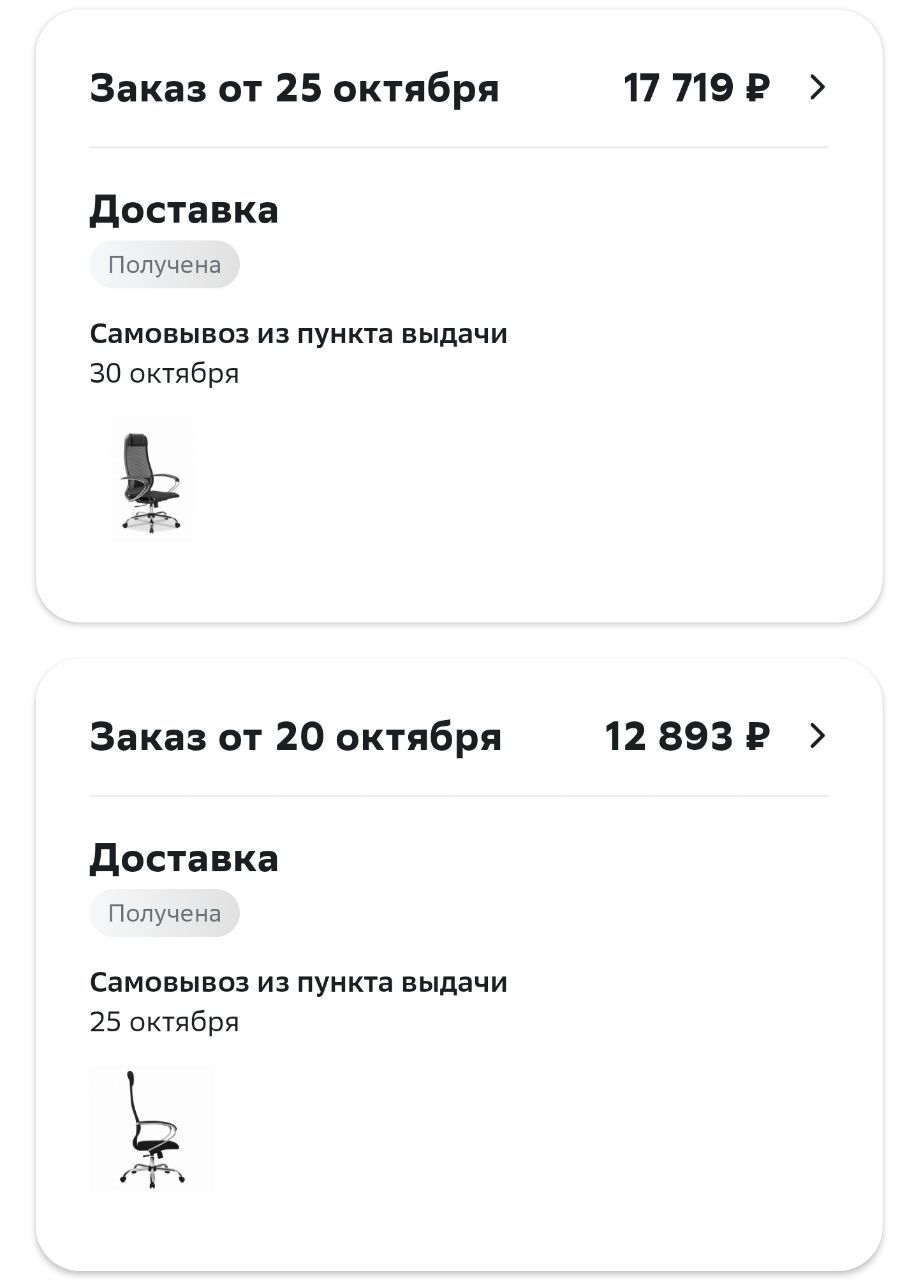 Заказал я как-то кресло для компьютера на маркете. Ну и пока собирали, пока я смотрел другие кресла в предложенной контекстной рекламе наткнулся на почти такое же кресло только чуть получше и подороже, плюс Мегамаркет обещал отличные бонусы за покупку. Не ну а че? Купил за 17 т а вернули 10 т бонусами спасибо. Ну и заказал 2е кресло т.к. первое уже было совсем интересно и уже включил режим ждуна. И вот настал тот день когда приехало 2 кресла причем первое должно было уехать т.к. раньше приехало и срок подходил для возврата товара на что я очень сильно рассчитывал. Вызвал курьера для забора своего заказа, дал ему номер 2го заказа. Курьер всё привез, загрузил кресло в коридор и был рассчитан. И по приходу с работы я выяснил одну маленькую нестыковку... Оказалось что сотрудники Боксбери каким то х##м выдали ему первую посылку но отметили у себя что это вторая... В итоге у меня оказался товар за меньшую сумму но в приложении Сбермаркета всё наоборот.