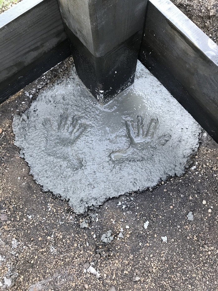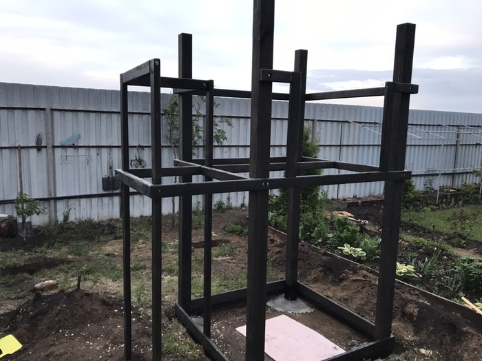 Вырываем яму под основание каркаса. Каждый элемент конструкции шлифуем, засверливаем и красим. Собираем и устанавливаем каркас будущего городка, заливая опоры цементом.