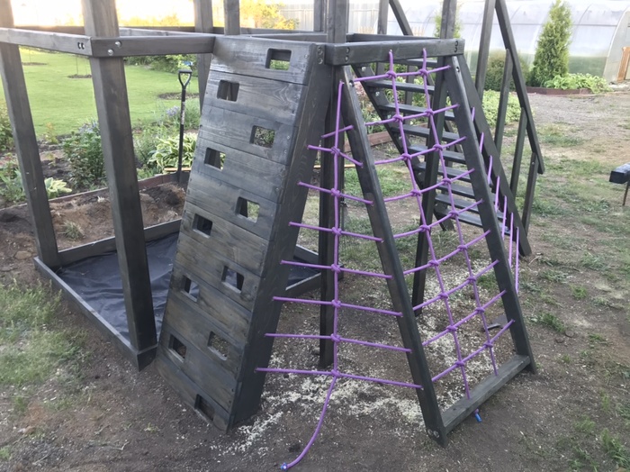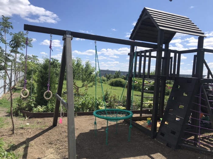 В заключительном этапе была сделана крыша, завезен песок и повешены кольца и качель-гнездо. Последнюю было проще купить, чем вязать самому.