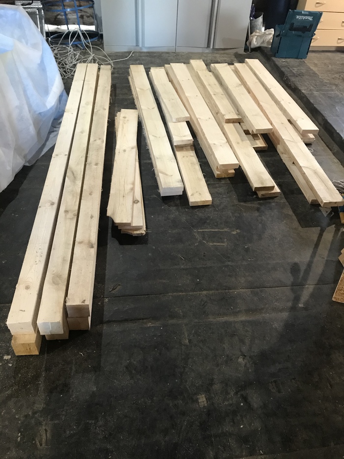 Брал все длиной 6 метров, пилил на куски уже на месте. Доска 40*150 распускалась пополам и служила основой для каждого элемента. Для пола/крыши/скалодрома использовал доску 25*150.