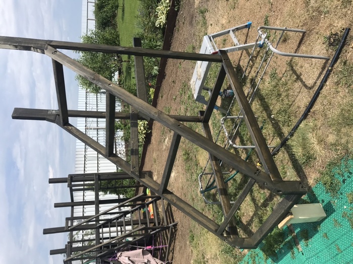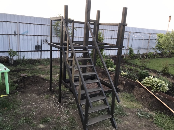Довольно быстро поставили распорку для качели и уложили пол второго этажа. После принялись за самую трудоемкую часть - горка. Опять же, из-за бюджета отказался от пластиковой горки за 6-8 тысяч в пользу оцинкованного листа железа и деревянного каркаса. Делал горку шириной 80 см, чтобы зимой можно было кататься на плюшке. Собираем основание.