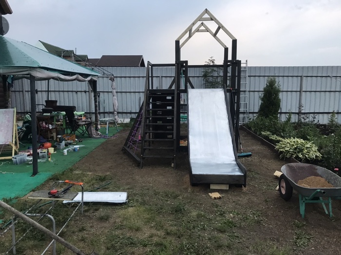 Затем укладываем доски под скат, прибиваем лист железа, приставляем к городку и проводим первые испытания. Хорошо, что летчиком-испытателем был именно я, а не дочка. Не смотря на то, что угол наклона был по ГОСТу для детских горок (всего 40 градусов), я сделал очень резкий и короткий выкат на горизонтальную поверхность. Как итог - удар сначала о нижний выкат, а затем вылет с горки на землю. Было больно и очень обидно…