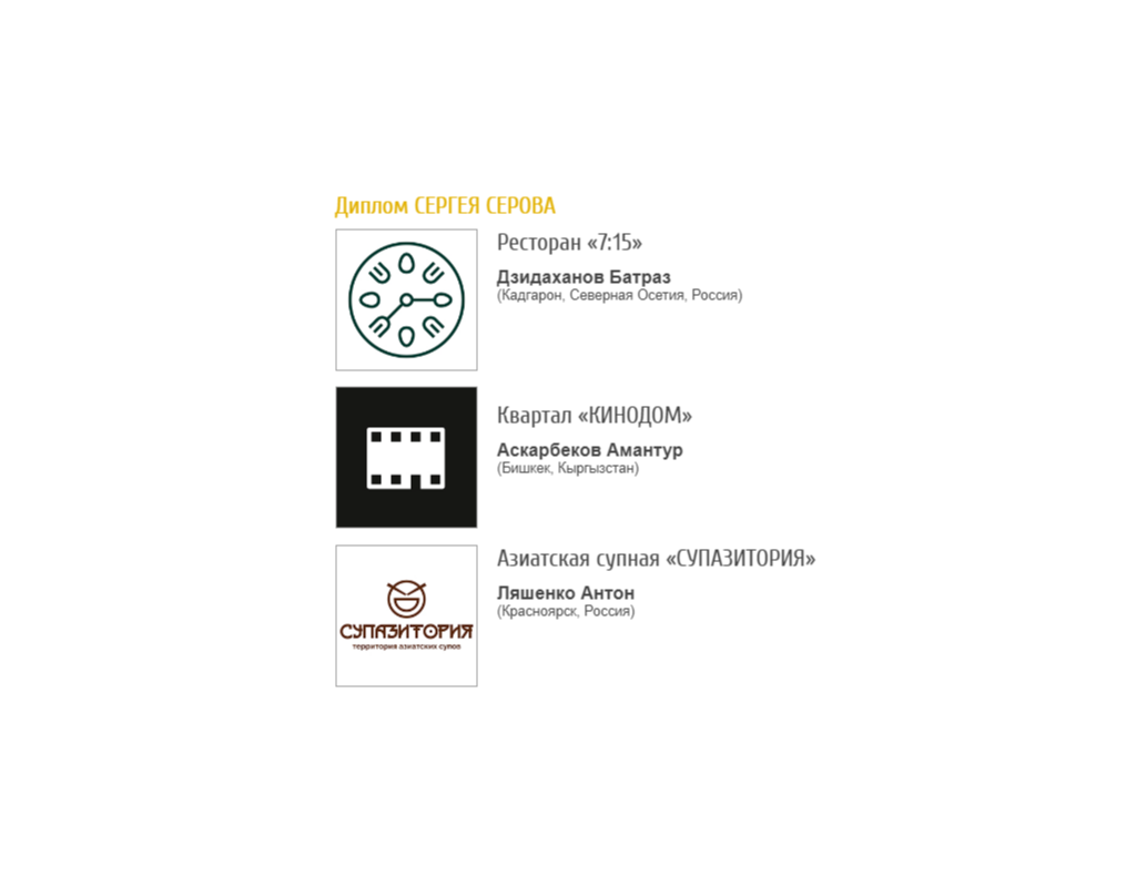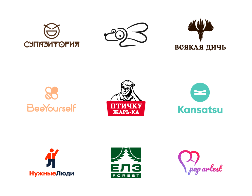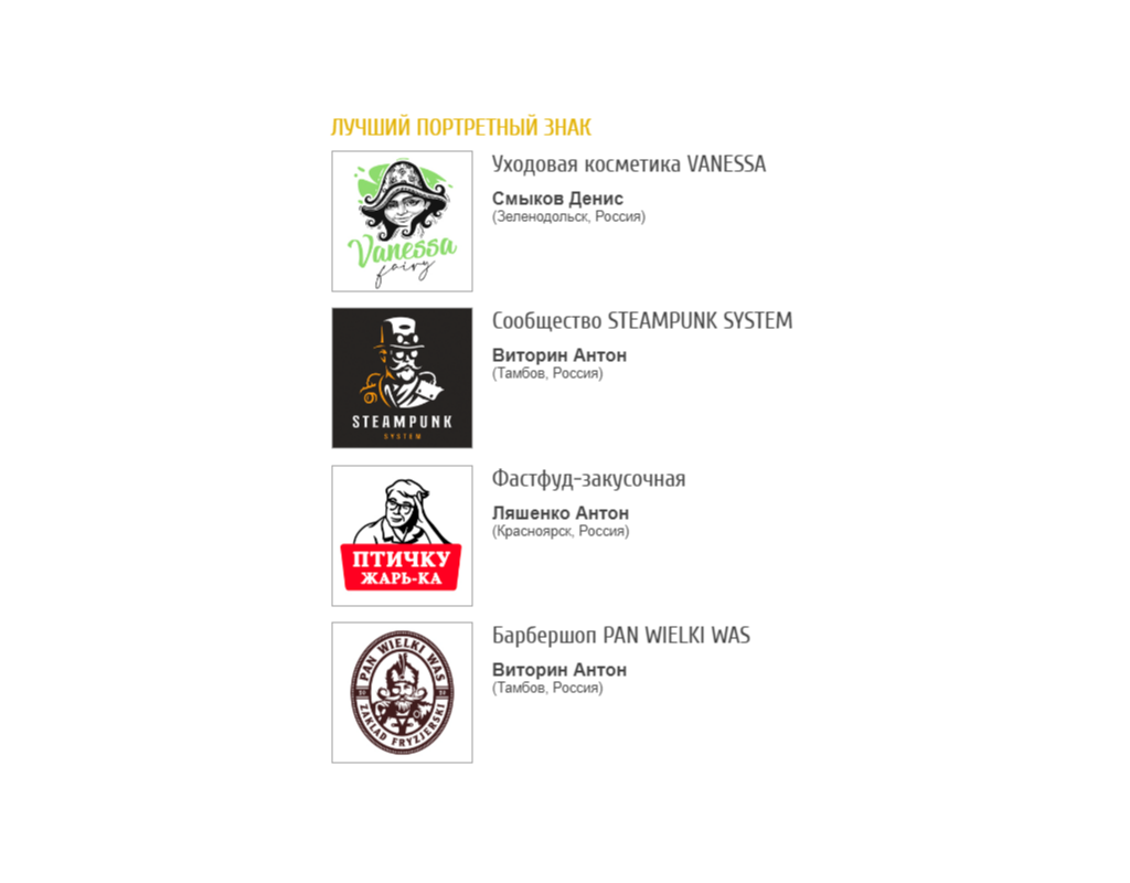 9 знаков моего агентства попали в лонг-лист конкурса, 2 из них – в шорт-лист, и оба были отмечены наградой. Логотип «Птичку жарь-ка» получил диплом в номинации «Лучший портретный знак», а «Супазитория» – специальный именной Диплом Сергея Серова (советско-российский искусствовед, куратор, дизайнер-график и «крёстный отец» Конкурса).