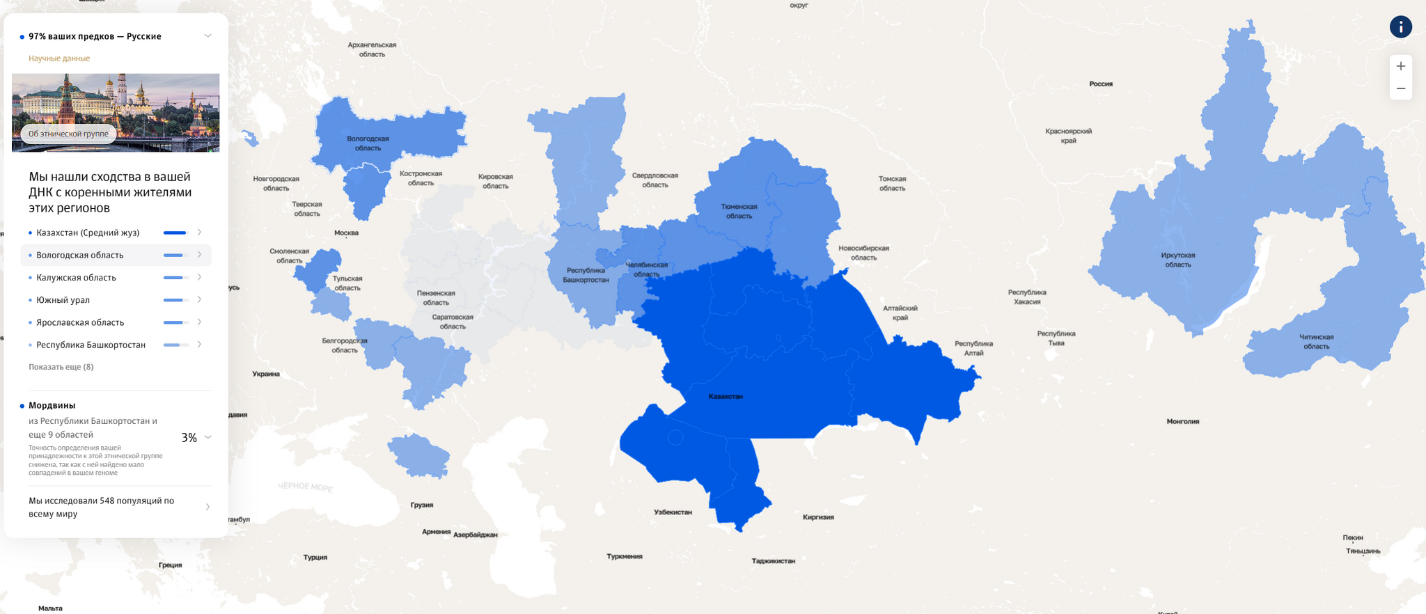 Самое интересное, что у меня сразу по 2 бабушкиным линиям и 1 дедушкиной море предков из сельской Белоруссии. Тест не увидел ни одного. Второй дед - старообрядец из подмосковья. Тест нарисовал меня почти казахом.