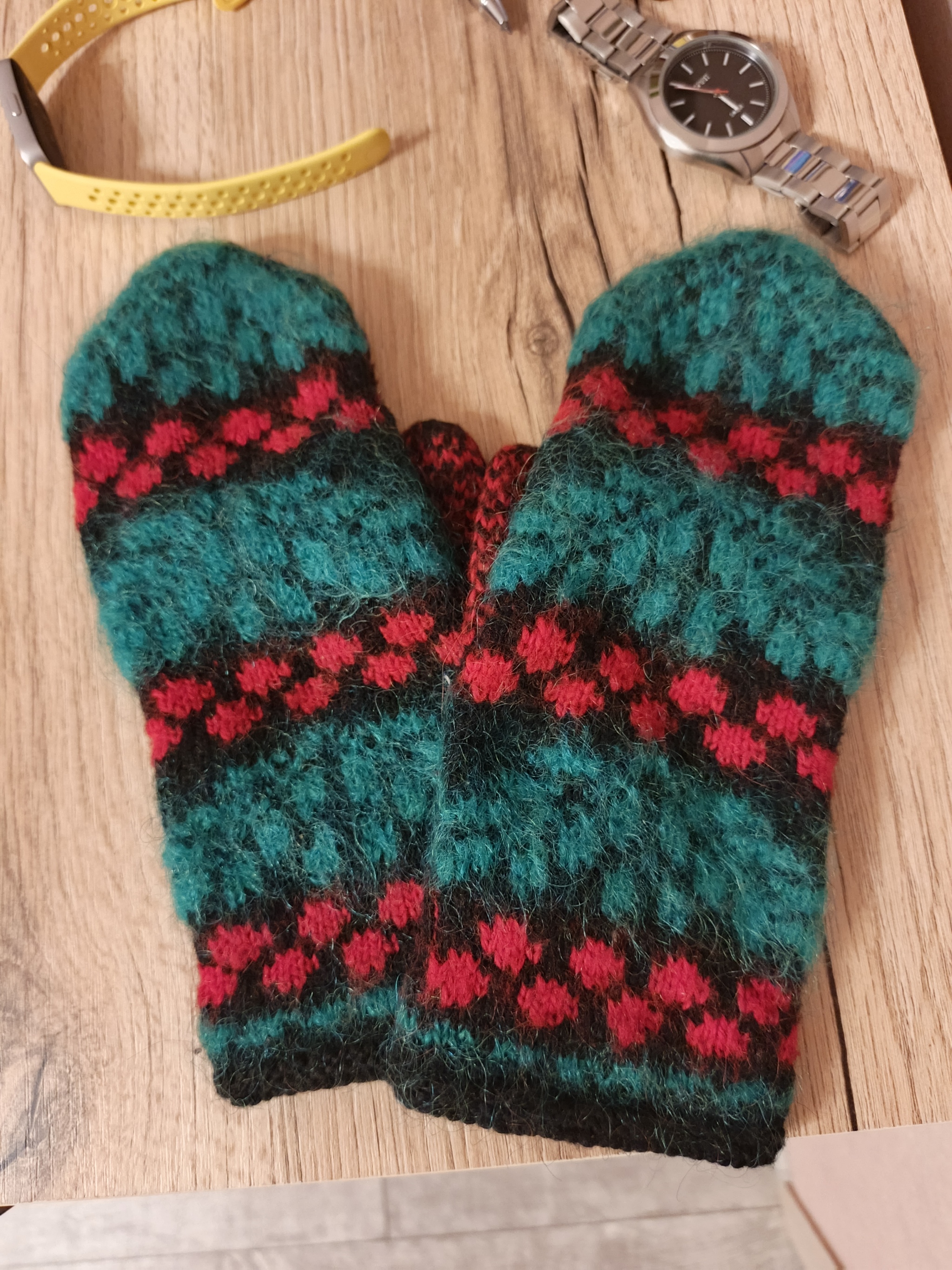 Очень красивые, яркие, но гармоничные, уютные рукавички! Мечтаю о свитере такой расцветки! Могли бы на заказ взяться?