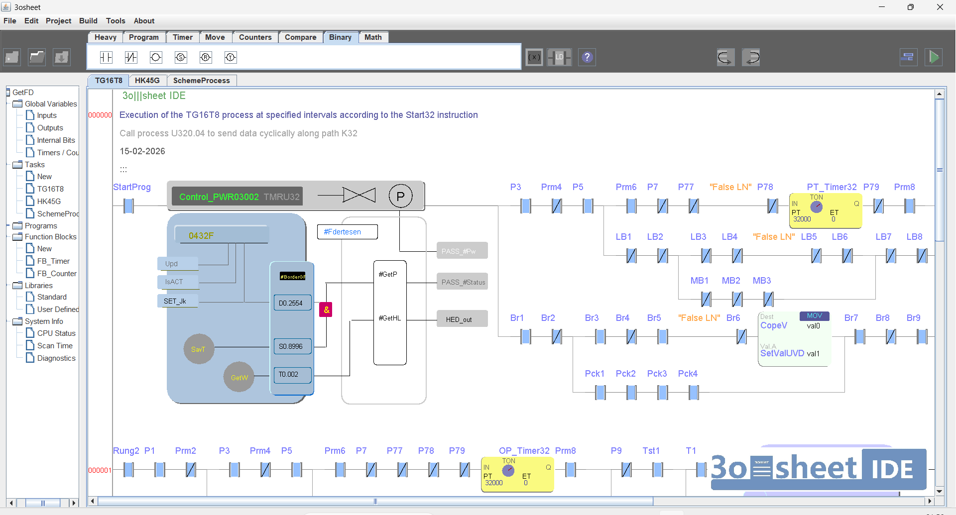 Создаем - тестовый проект в языке LD. Моя среда поддерживает FBD но так же пока только внутри LD. ST язык я не реализовал в полной мере, но на каком бы языке программа ни была, она переводится в единый виртуальный ассемблер (собственный синтаксис и инструкции, см. прошлые посты) который выполняется внутри на голом железе Микроконтроллера, FPGA или любого CPU.