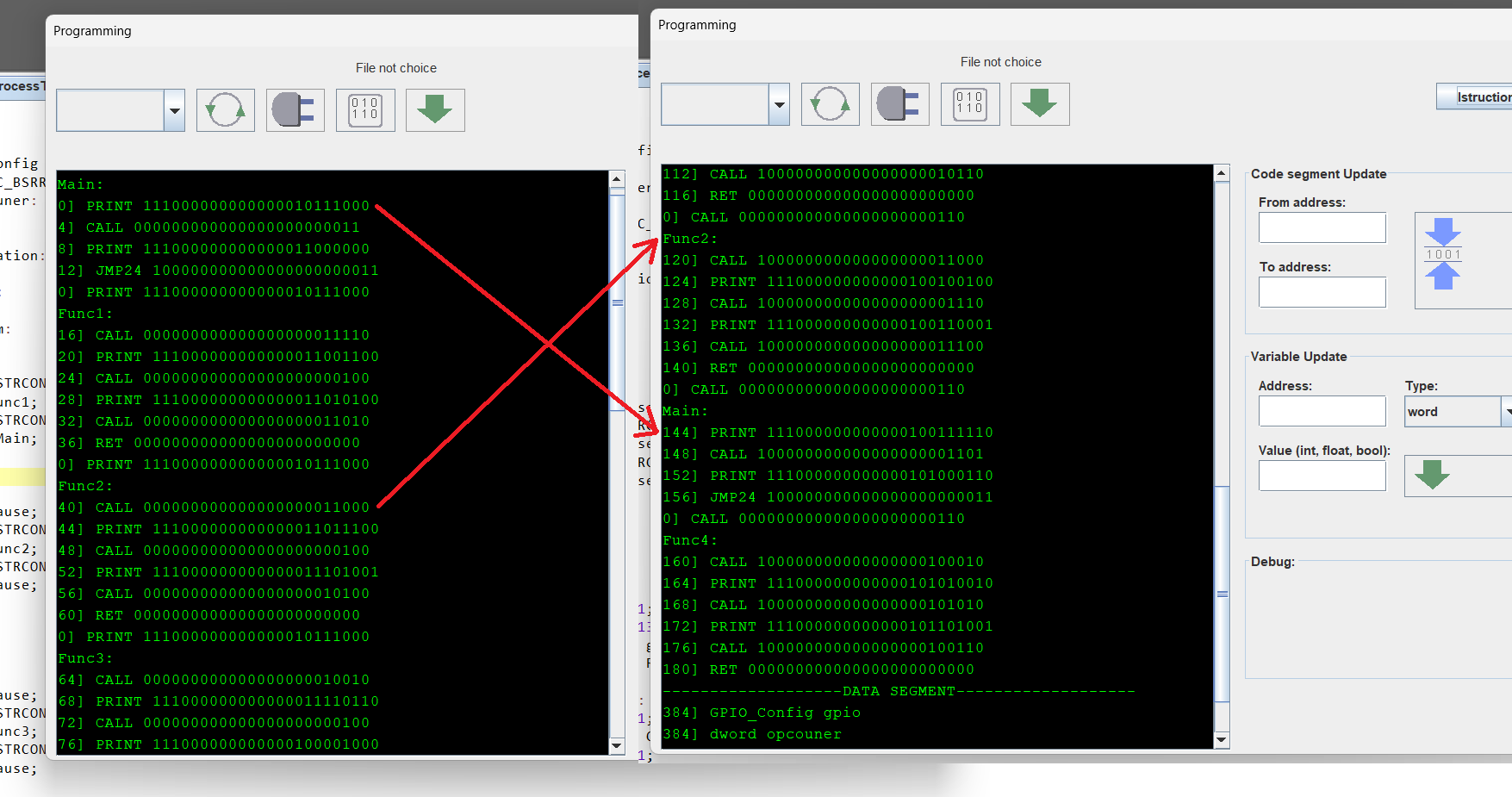Любая программа, LD ST C++ не важно, состоит из блоков кода и функций. Мой компилятор их и перемешивает по разным адресам и разным знакам (+-) направлениям перехода. Если мы скомпилируем программу, то получим пространственные -разные версии одной программы: