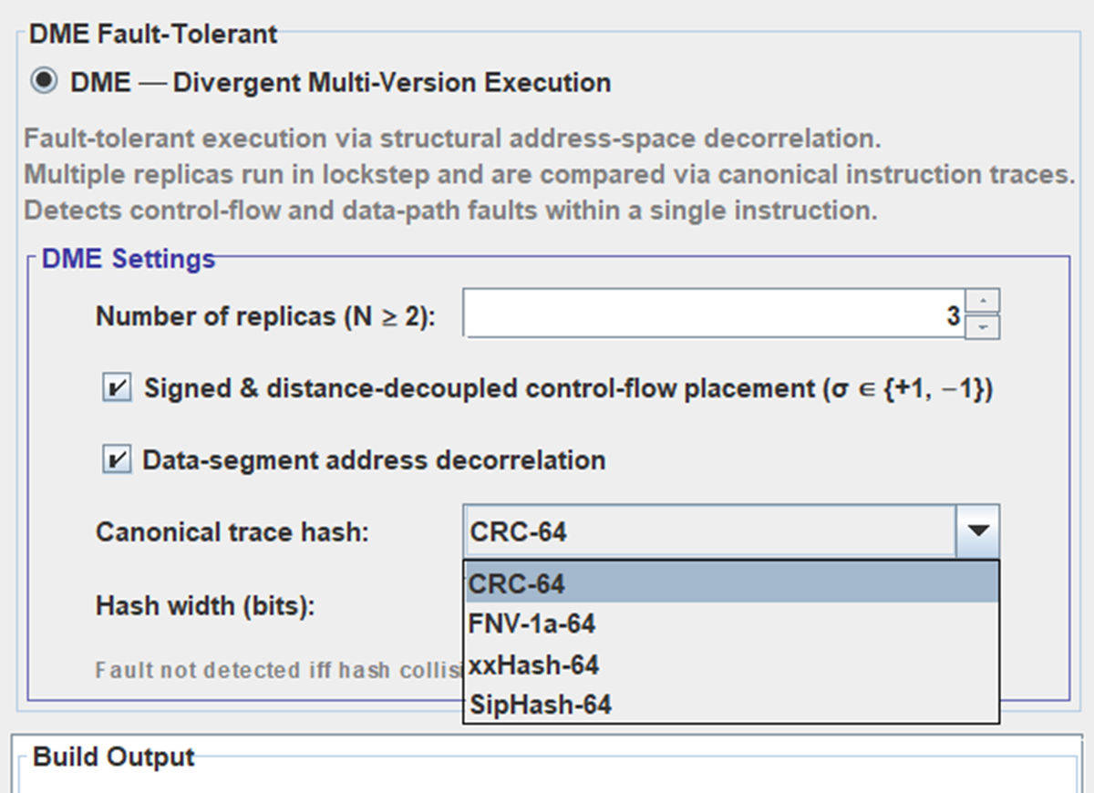 Дивергентного Многоверсионного Выполнения Программ (DME). Суть ее в множественной N компиляции одной программы. Так называемая - программная (а если это на FPGA или многоядерных CPU) аппаратная избыточность типа Lockstep / TMR.