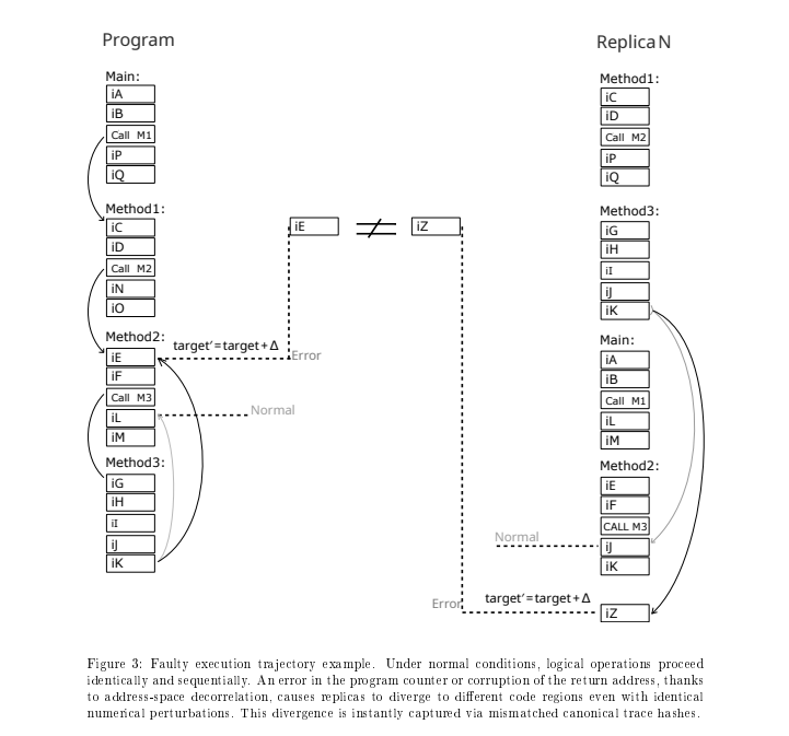 Canonical trace hash: Инкрементальный хеш выполнения программы (если есть аппаратный хеш как у Cortex M4) , но на слабом железе вместо хеша может подойти обычное сравнение каждой инструкции (опкода или результата) каждой копии программы простым "=", или хеш может быть банальным XOR с степенью ( за 2 такта, это + 10..20 наносекунд к выполнению инструкции, дешево ).