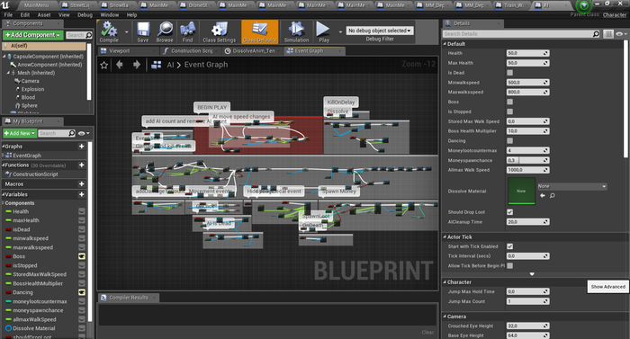 Открытый проект моей игры. Видно блюпринтовый скрипт ИИ для игры. Количество вкладок это норма, обычно их еще больше и приходиться постоянно переключаться.