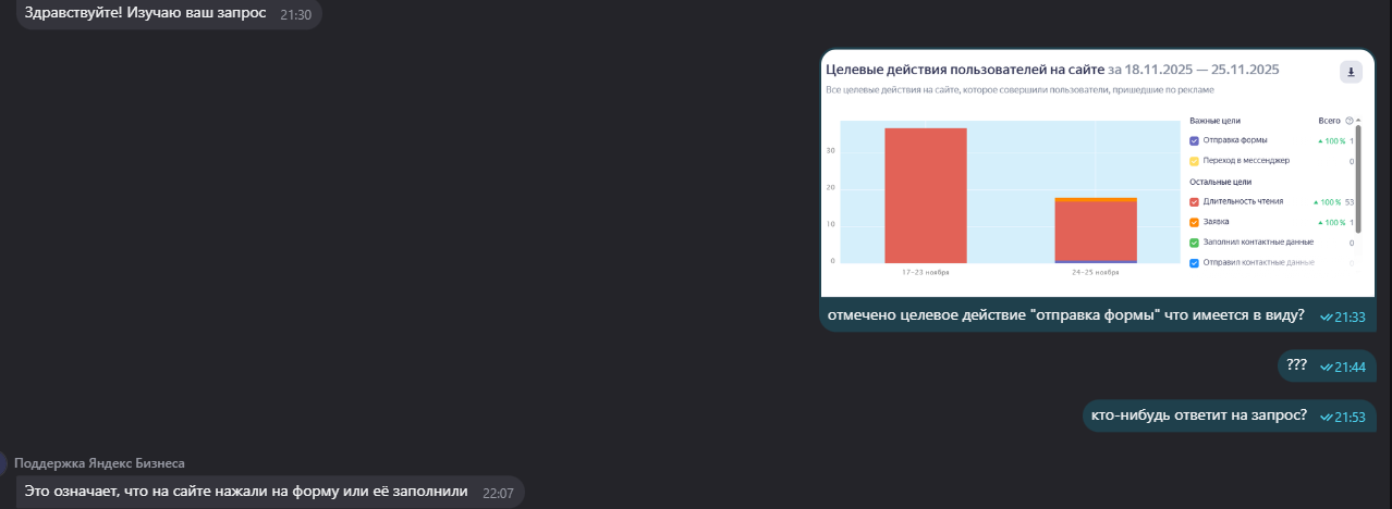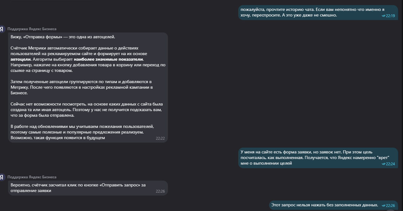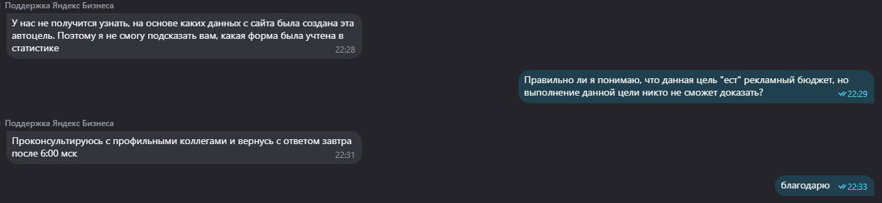 Апогеем всего этого мероприятия стала ситуация с выполнением целей. Есть некий набор целей, который отслеживает платформа и за это берет деньги. Очень дорого стоит "отправка формы с данными". И вот вижу я чудо. Цель по отправке выполнена. Смотрю во все известные мне места, где могут быть заявки, а их там нет.
