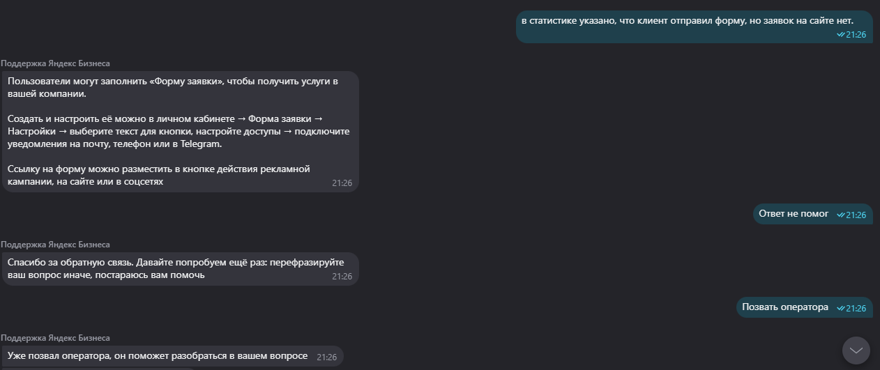 Мне всегда казалось, что операторы предварительно читают чат, прежде, чем отвечать на запрос. Ведь люди борются с ботом и что-то ему пишут. Больше получаса на ответ Капитана Очевидность.