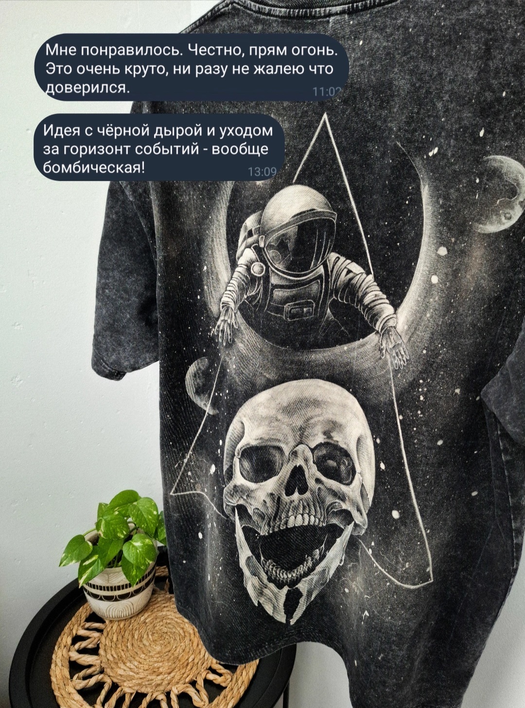 По концепции - заказчику нельзя вмешиваться в создание макета. Никаких "мы посовещались с семьёй и наша собака решила, что будет нарисовано..." нет, этот момент я отсекла еще в бытность графическим дизайнером во избежание внеплановых визитов в ПНД. Макет я придумываю сама, если вам это не подходит - ну штош тут поделать. А на космо-футболку человек дал чёткое тз (я не знаю как так вышло, магнитные бури или звезды сошлись в фразу "да едрись оно конём") причем у него по этому тз даже ИИ облажался и нарисовал не то, что он хотел ¯\_(ツ)_/¯ А я, вот такая пися-бабочка, осмелела и решила, что у меня получится