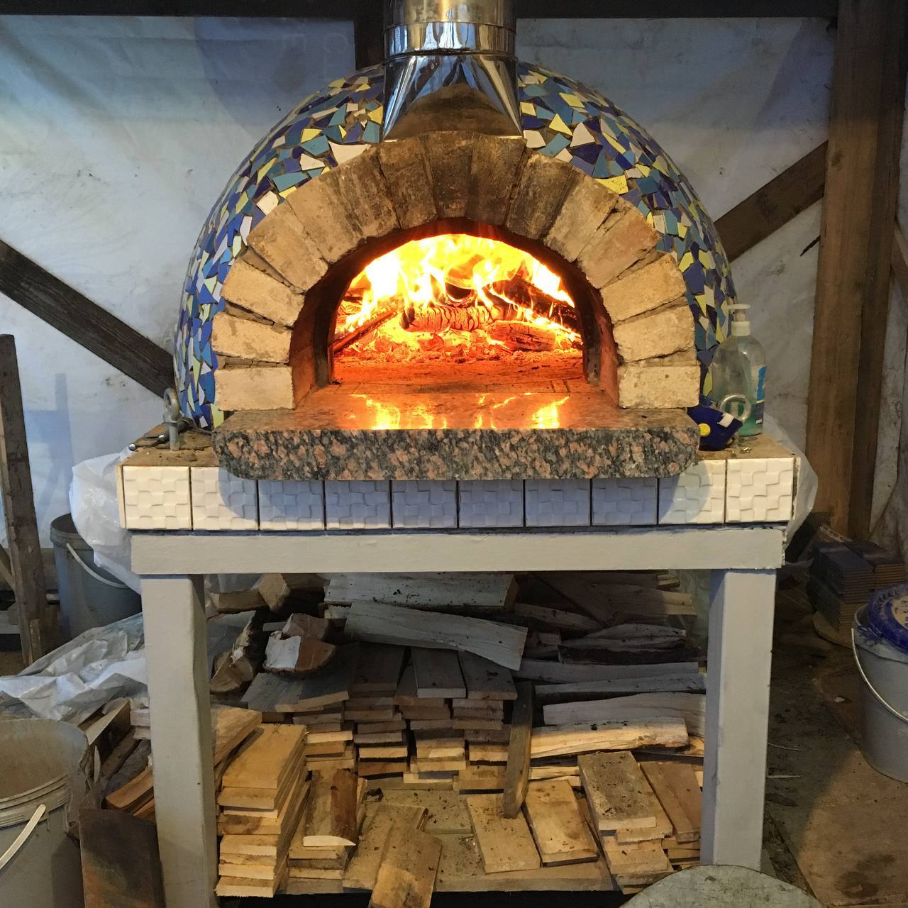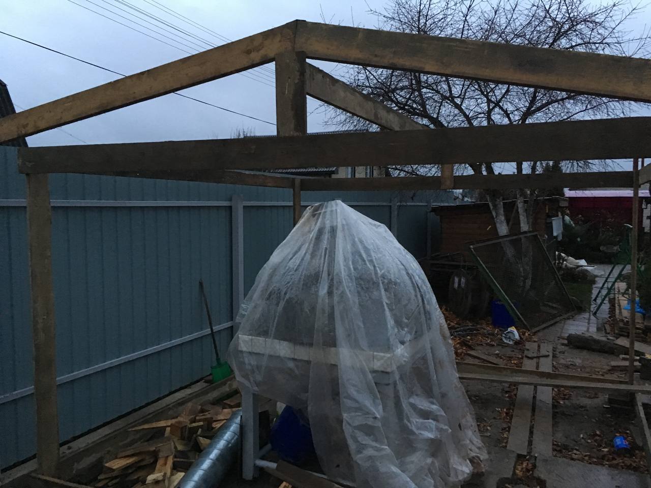 Тут прошло лето и решили построить маленький сарай вокруг печи, чтобы было тепло и можно было приклеить плитку.