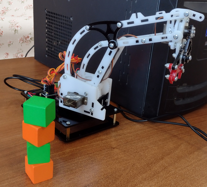 Робот получился очень похожим на промышленные манипуляторы, которые мне доводилось видеть, только намного меньше, конечно. Сын с ним часами занимается, доходит до того, что приходится отбирать и прятать, ведь домашние задания в школе никто не отменял. Да и сама я, что греха таить, «залипаю» порой. Следующего робота будем с сыном делать уже вместе.