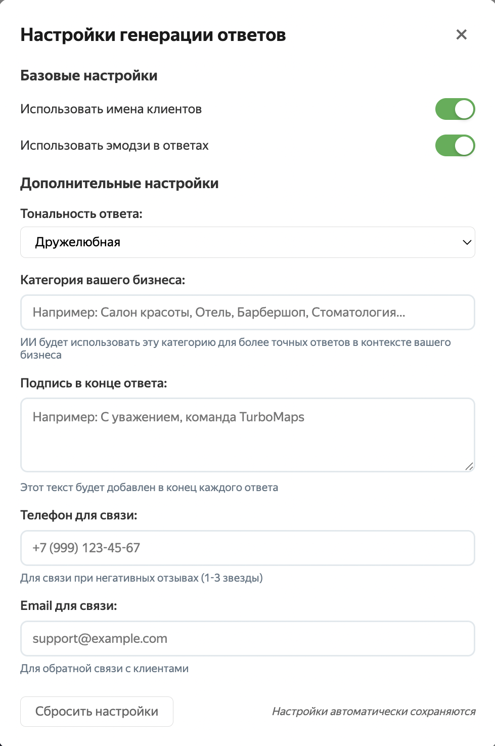 В расширении предусмотрена возможность отключить персонализацию, эмодзи, выбрать тон, добавить подпись и контакты для негативных отзывов.