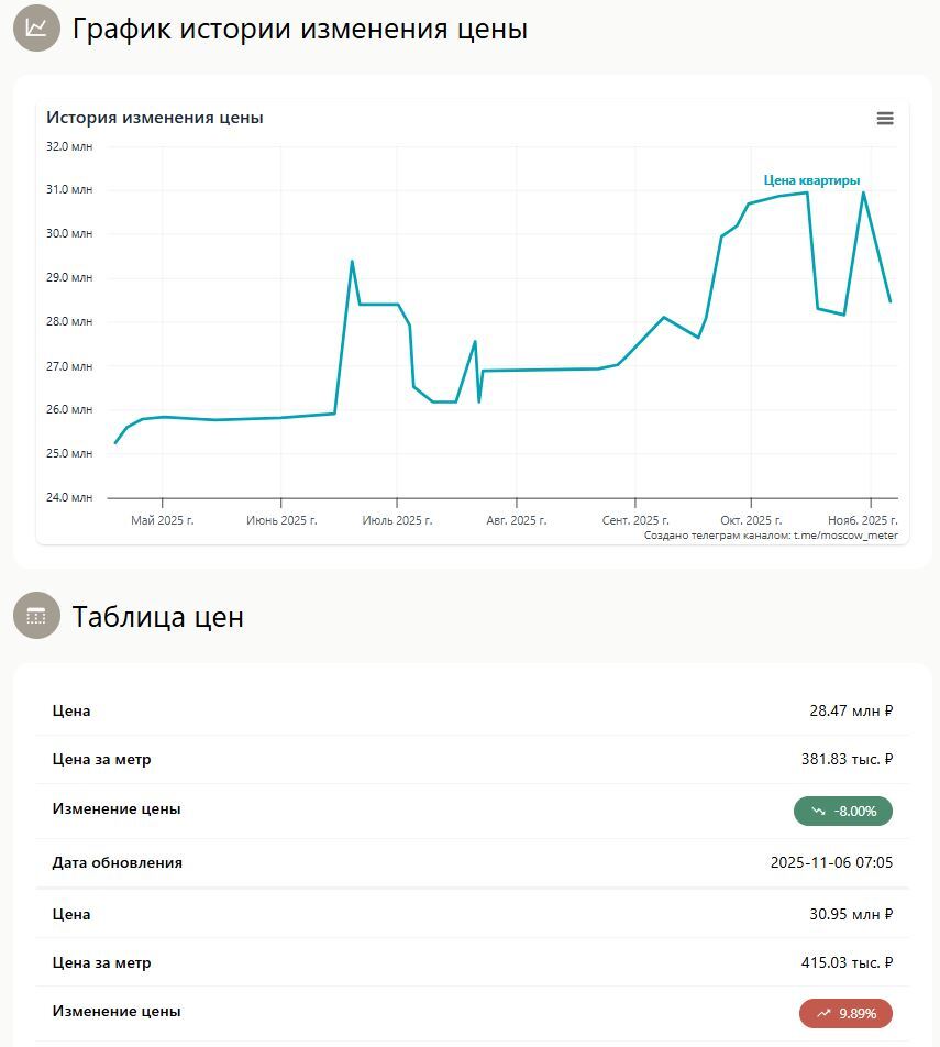 И действительно, цена постепенно росла, но резко снизилась 6 ноября и стала меньше цены по которой квартира стояла еще в мае. Можно считать скидку реальной.