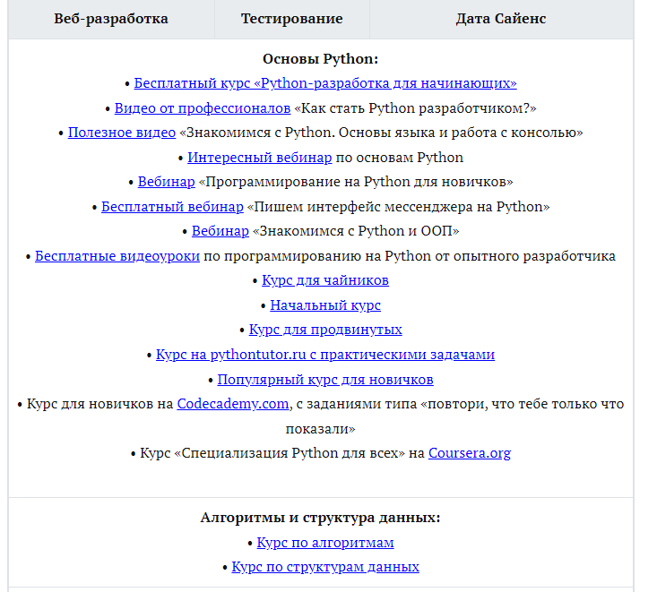 Спустя год начал опять вернулся к идее стать программистом. Вбил в поисковик запрос о Python-программисте и случайно наткнулся на этот пост https://professii.su/programmirovanie/python-razrabotchik.html. Что поразило, так это то, что в ней были почти все ответы на мои вопросы. А главное - в конце представлено большое количество полезных ссылок на учебные материалы. Вот как это выглядит: