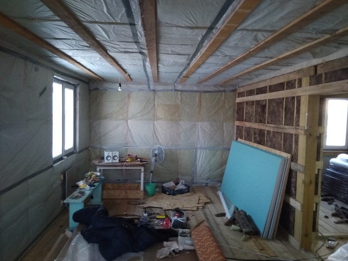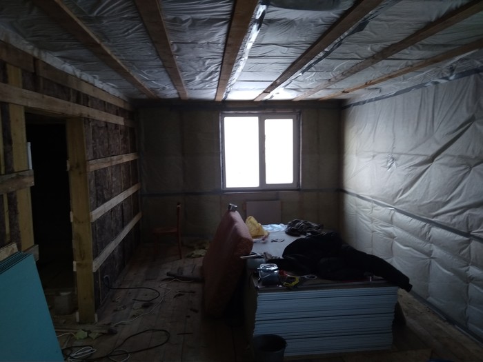 За это время утеплил все стены и потолок первого этажа, поставил перегородки, установил шумоизоляцию, приколотили доски под гипсокартон, поставил конвектора. Фотоотчёт для вас.