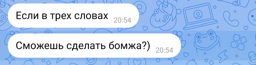 Обговорили внешний вид бомжа, размеры и прочее. За основу было взято фото из интернета: