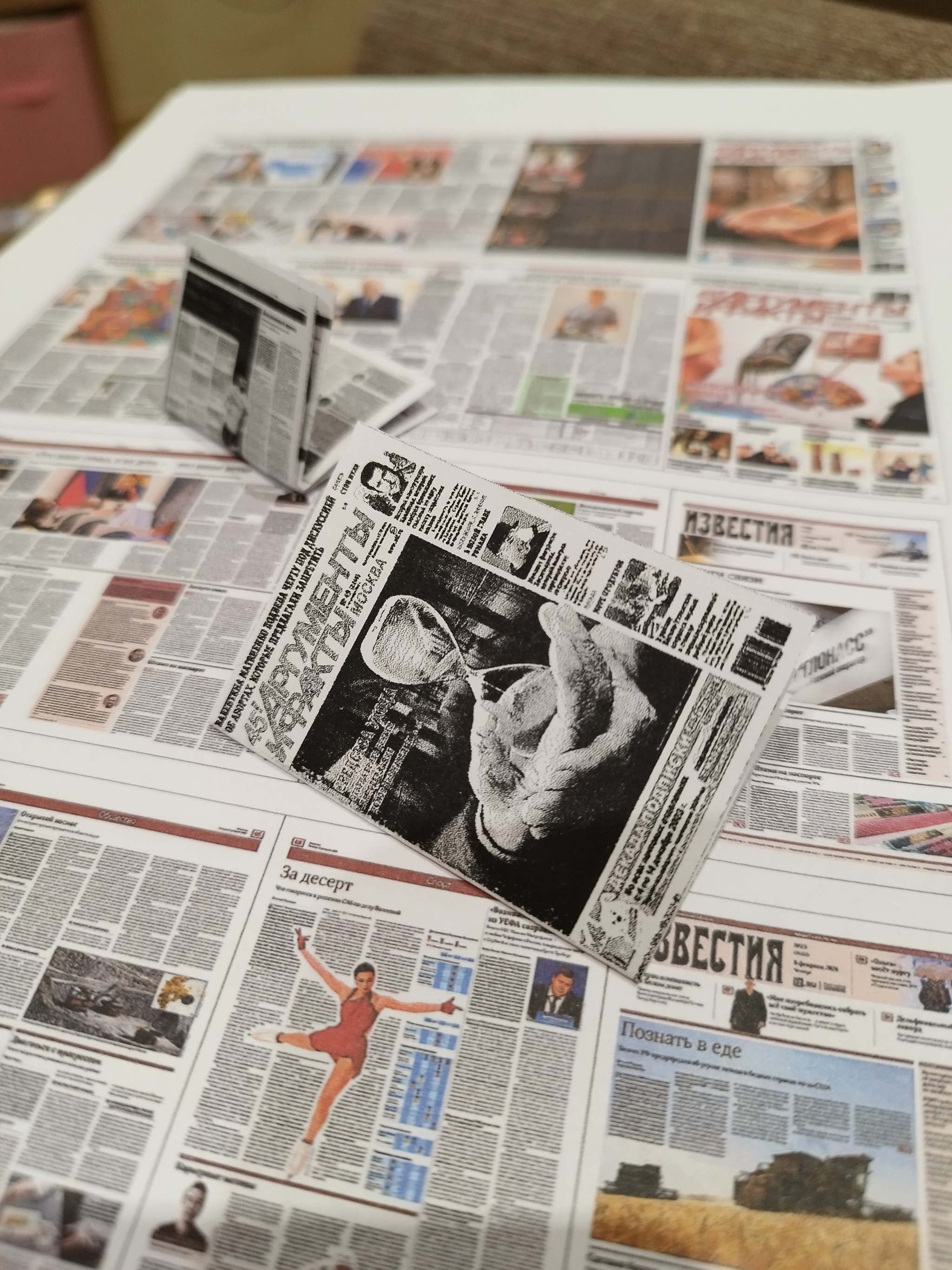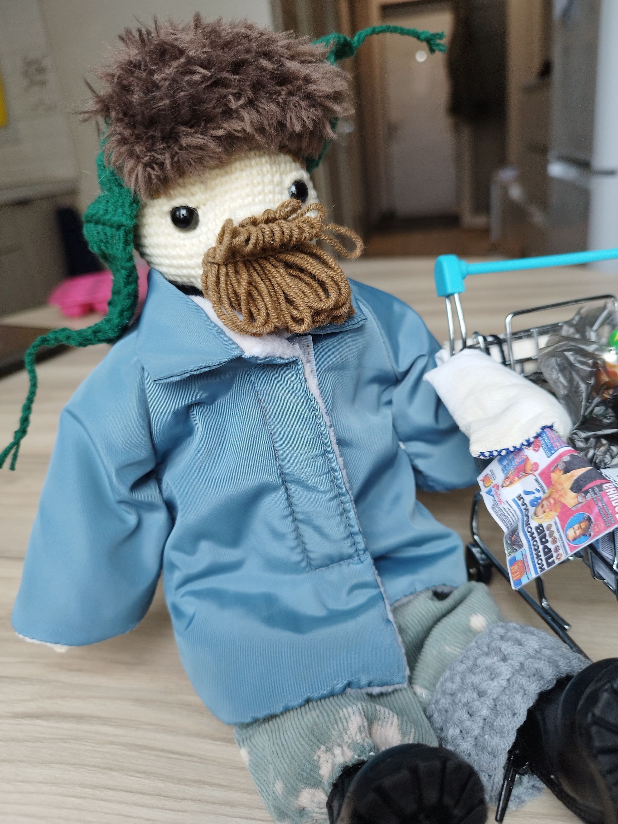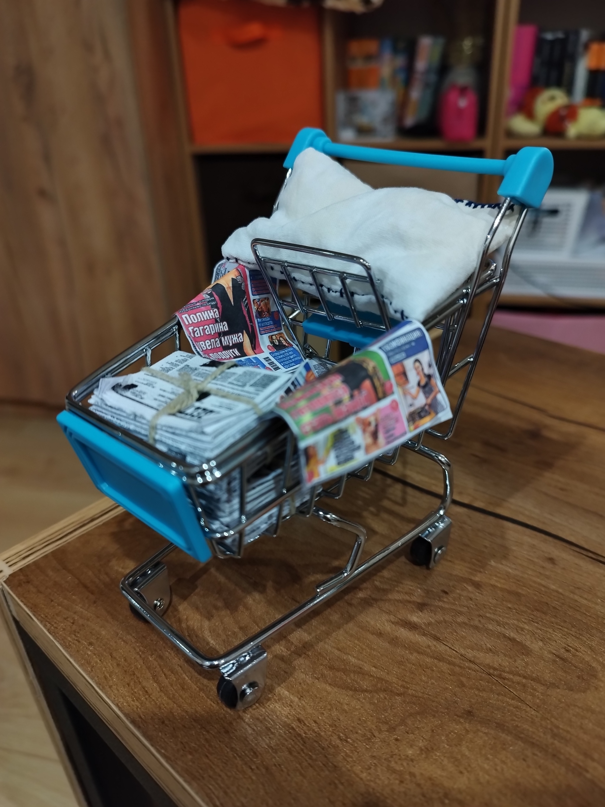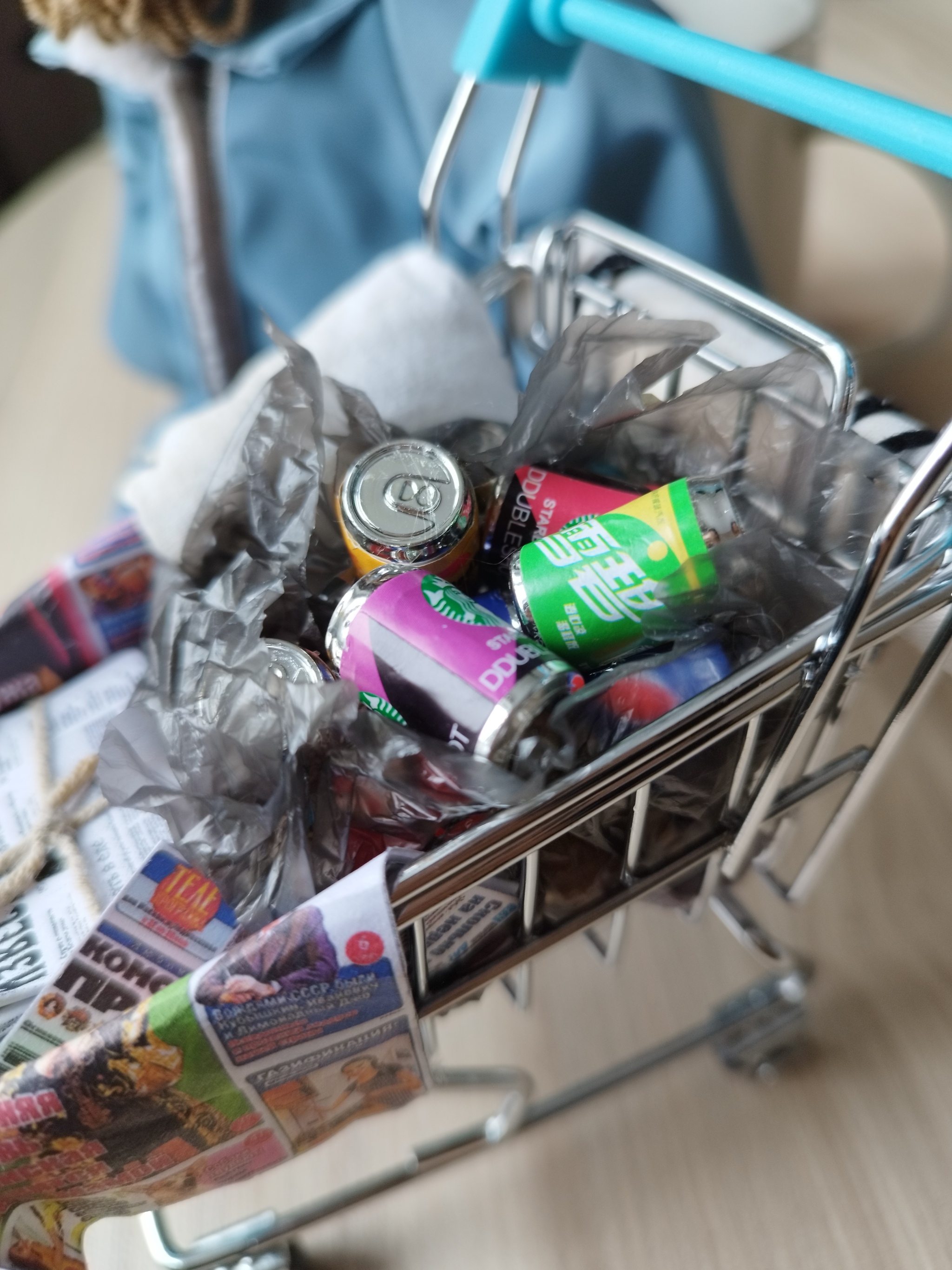 Дополнительно сделала бомжу тележку. Хоть мне и сказали, что у наших это не принято, хотелось его как-то облагородить. В тележку пошли мини-газеты (купила и размножила), банки, старый пакет, а ещё самосшитые подушка и плед.