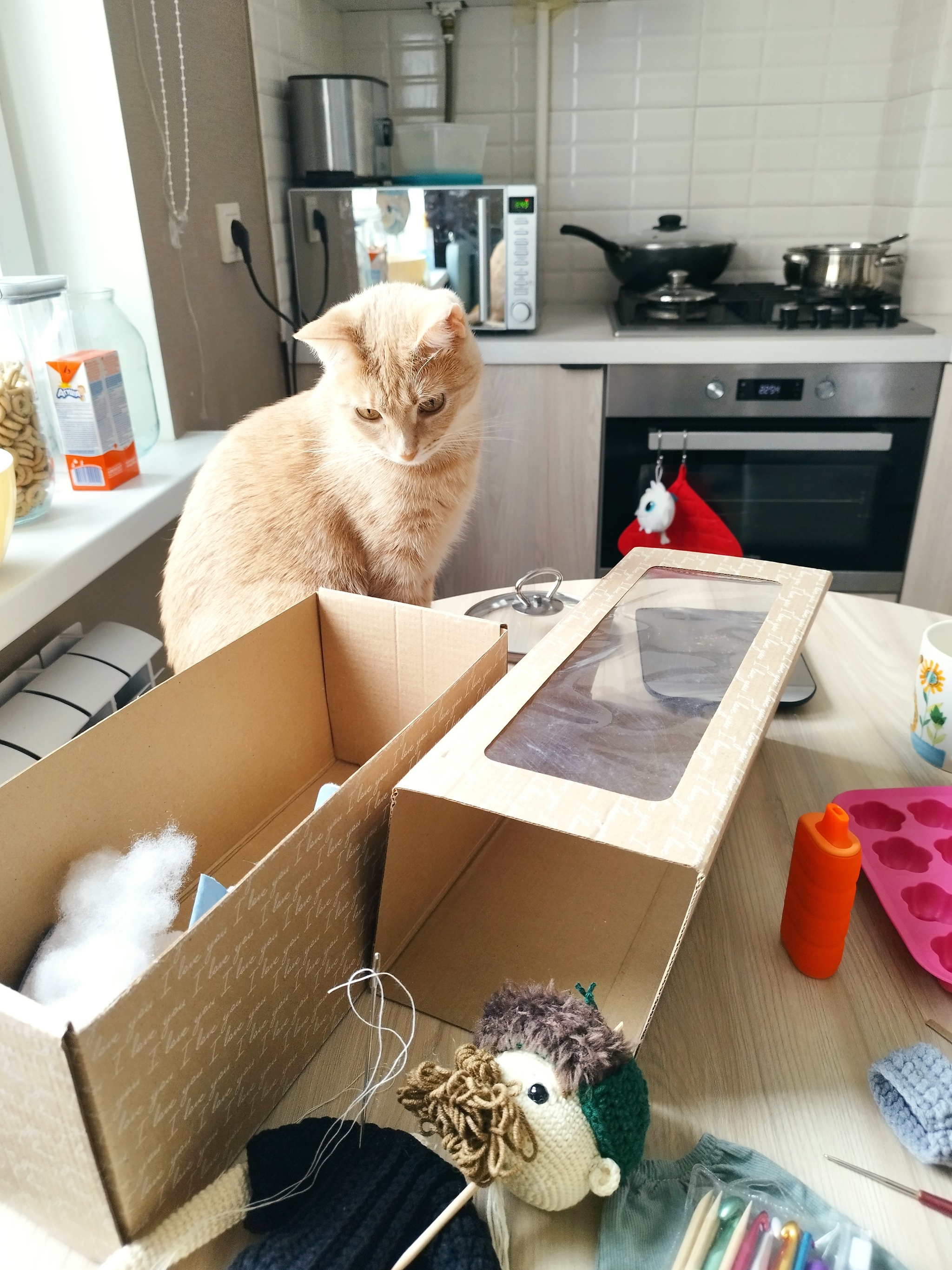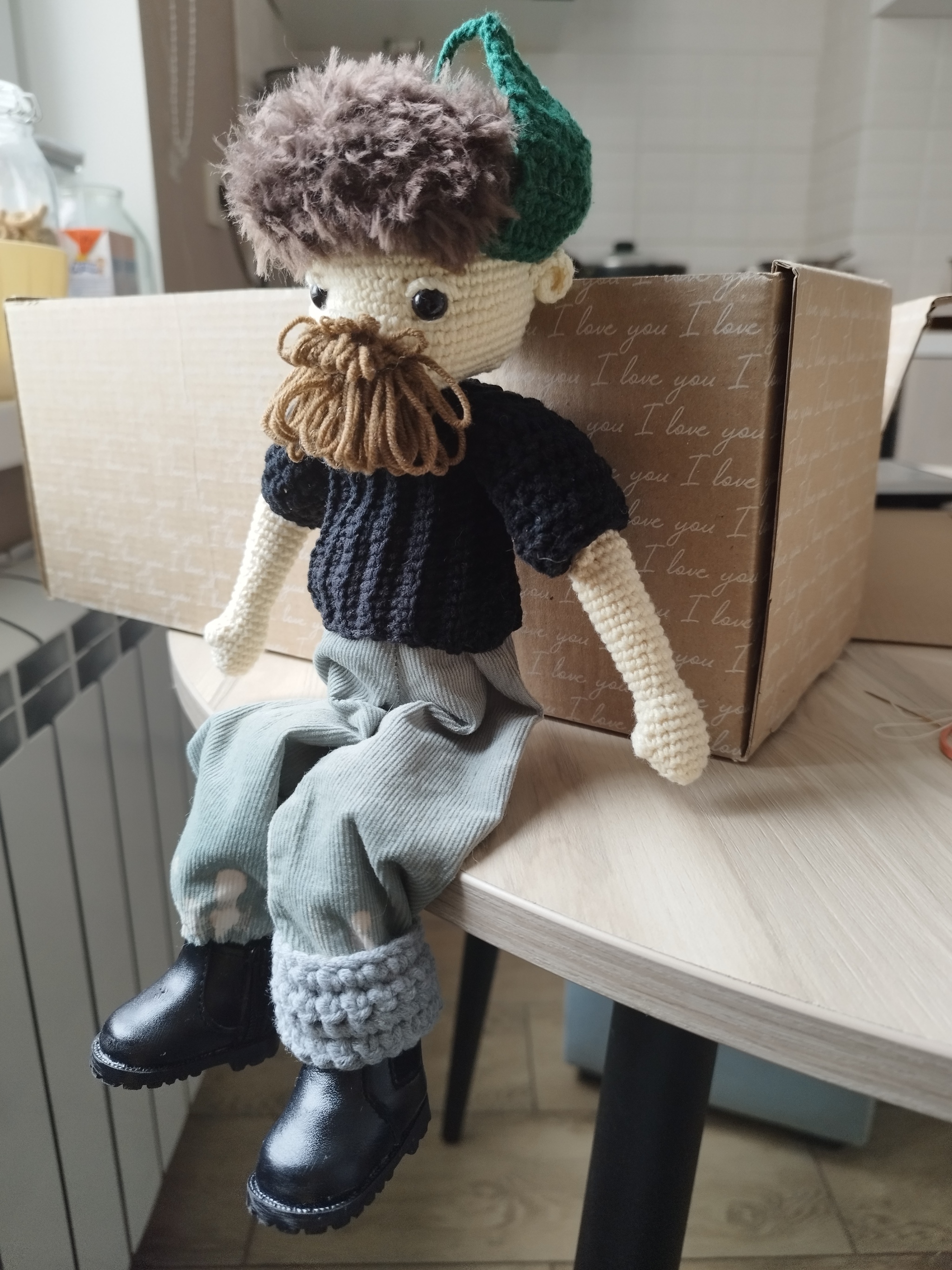 Жду теперь с нетерпением отзыва от получателя, так как друг заказывал этого кавалера в подарок. Такого опыта вязания у меня ещё не было. Было очень интересно, муж уже встал в очередь за куколкой сисадмина)