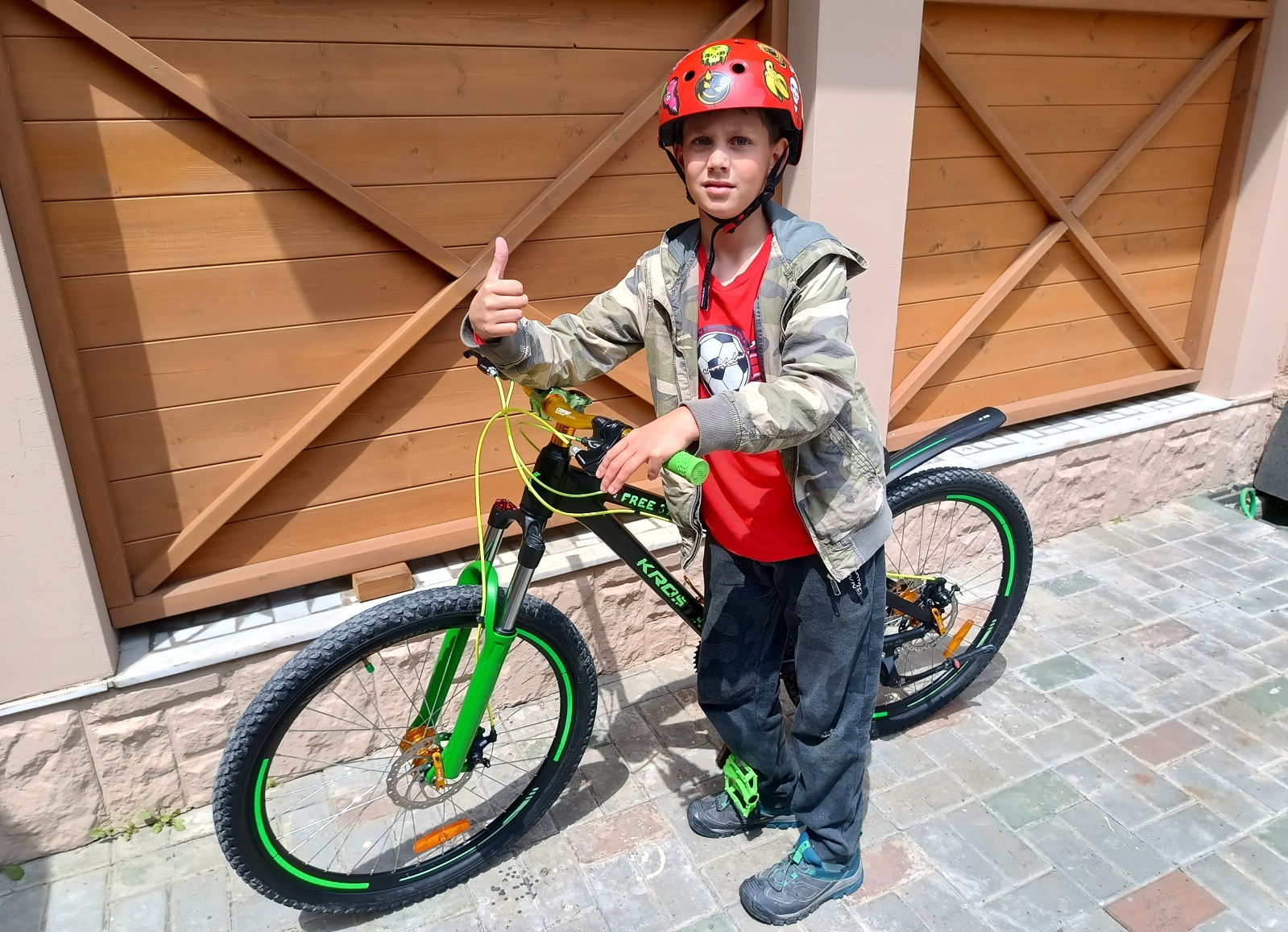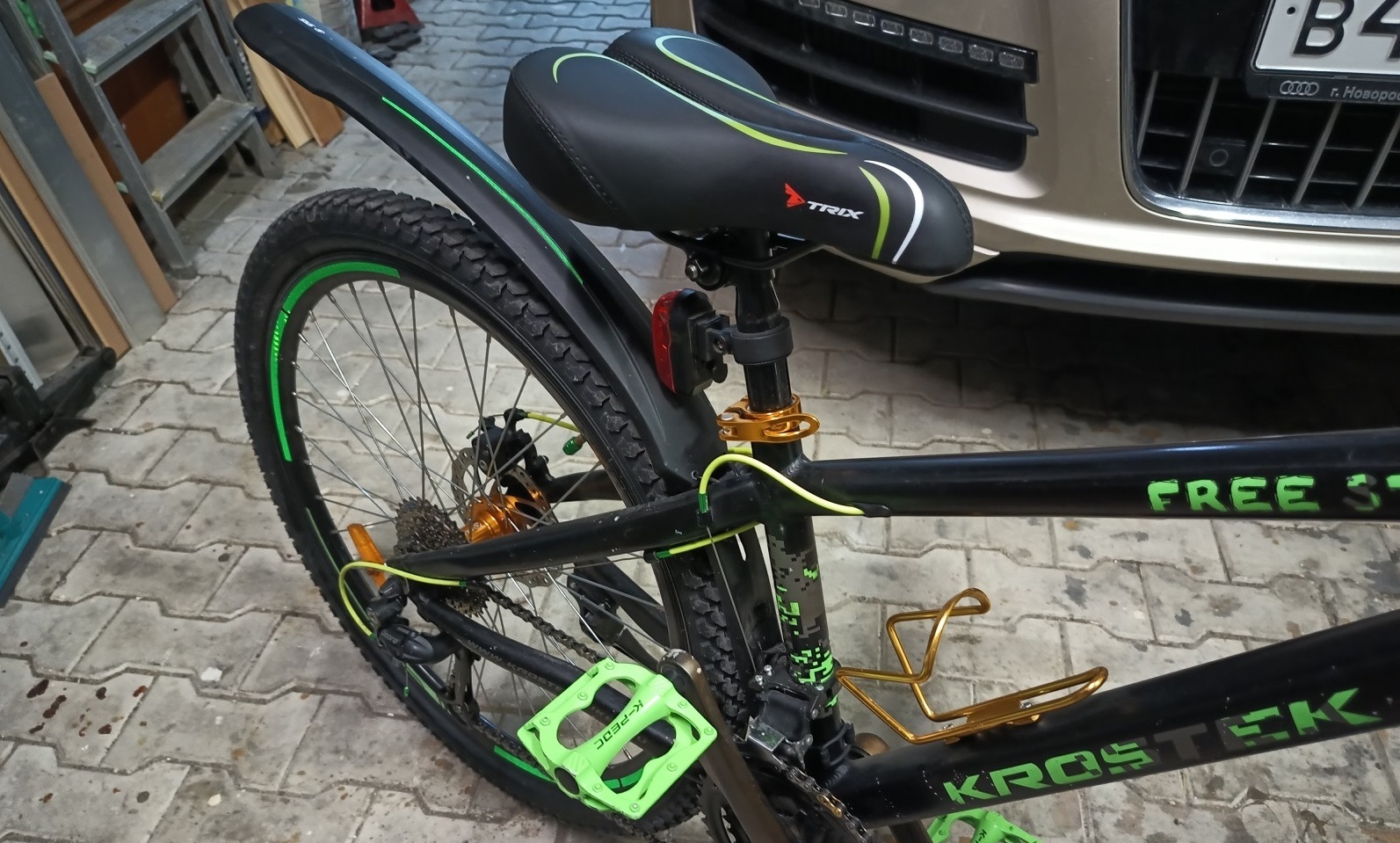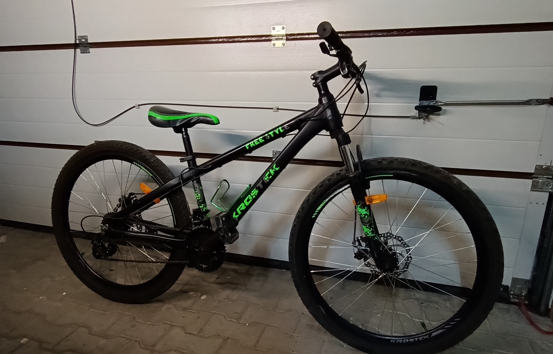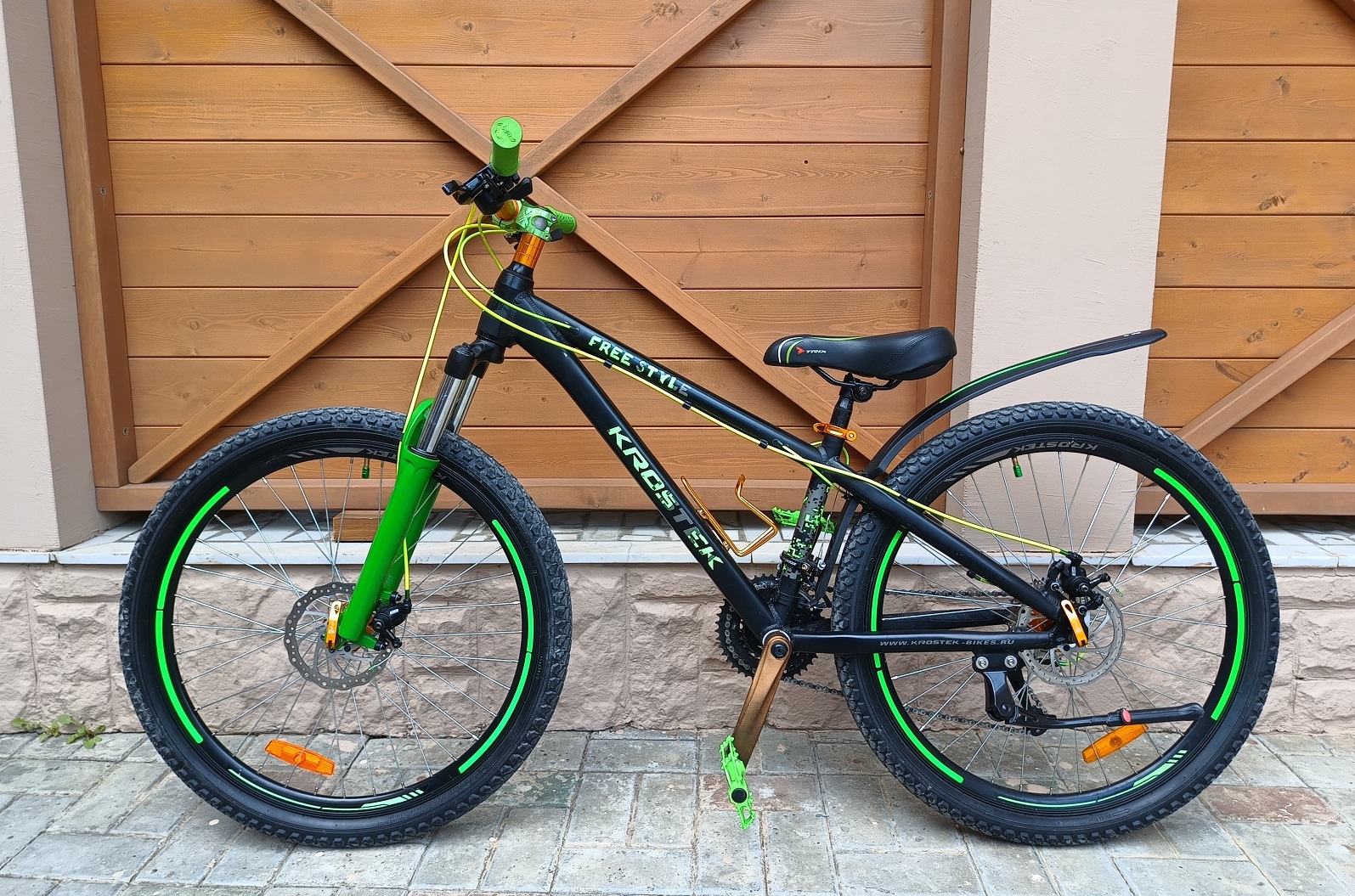 Критерии поиска на Авито были достаточно простые, алюминиевая рама и дисковые тормоза. В итоге был найден китайский товарищ KROSTEK Freestyle 600 на алюминь раме с частично скрытой проводкой, Торнео вкруг, комборучках и 3/7 по цене аж 8 тыс. руб. Быстрый осмотр показал, что на велике были ушатаны тросики переключения и задняя покрышка, а в остальном все достаточно неплохо. Поэтому ударили по рукам, и велик сменил владельца. Кстати, есть еще один момент, сын очень сильно загоняется по зеленому цвету, для него зеленый значит красивый. И поэтому черная рама с кислотными буквами – был беспроигрышный вариант.