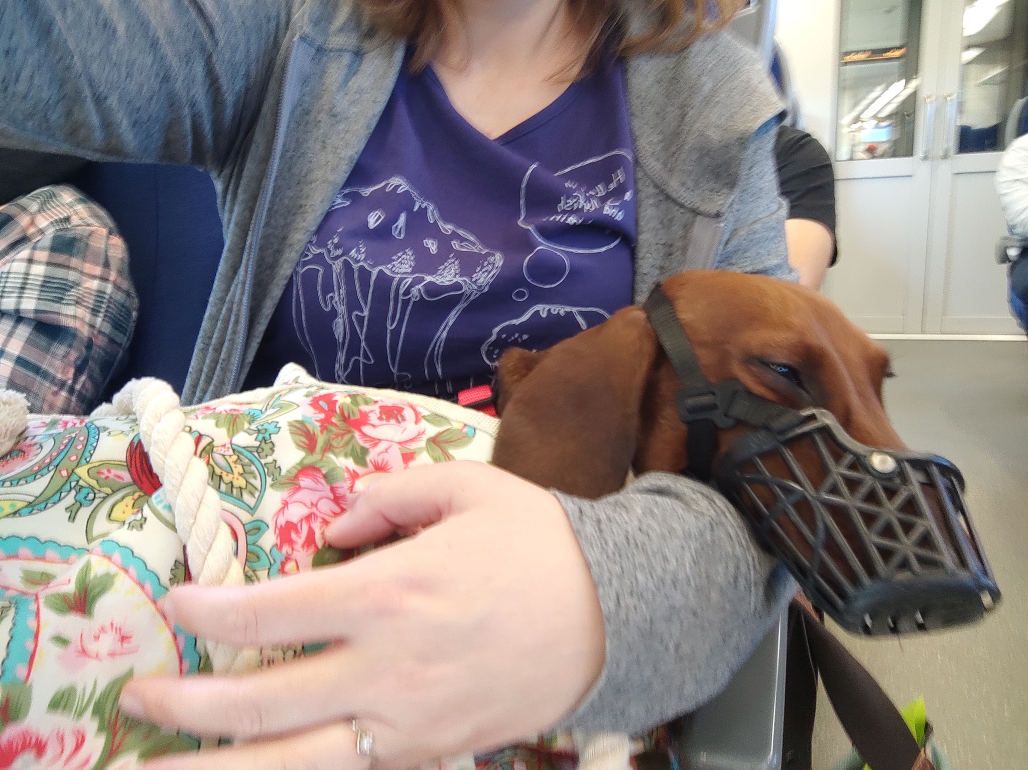 Я не вожу, поэтому решили ехать на поезде-экспрессе. Удобной по времени была Ласточка, в ней были вагоны для провоза мелких животных. То есть в переноске. Собачий билет покупается вместе с человеческим (пёс оформляется как ручная кладь). Вроде, всё просто, НО, переноска нужна стандартная, закрытая. Мой пёс в такой орет, как сам не свой, поэтому для него я переоборудовала большую пляжную сумку (жесткое дно для спины, плед, собака постоянно как будто на руках, меньше стрессует, при этом находится в положении, безопасном для его позвоночника). Дабы не было претензий со стороны РЖД, нацепили намордник. Но претензии все равно были, проводник попросил прятаться от начальника поезда. Ну ок. Правда, начальник, проходя мимо, внимания не обратила. Кстати, если собираетесь ехать с животным на электричке, билет можно купить только в кассе (в приложении не для всех регионов это возможно, в самом поезде приобрести билет нельзя). Доехали. Пёс был голодный перед наркозом, и поднывал периодически, но большую часть дороги проспал.