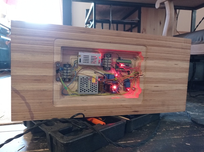 Расскажу немного о технической стороне вопроса: светильник управляется посредством ИК пульта, включает/выключает подсветку и головной свет, он же приводит в движение мотор и сервоприводы. В платформе торшера расположились "мозги" (Ардуино), блоки питания, реле и драйверы.