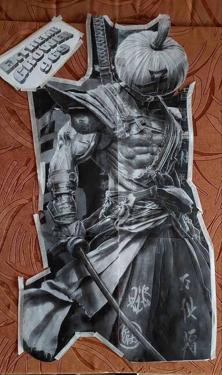 Как-то так. Согласен, вообще не похоже на оригинал, но такой цели и не ставил, я вот так вижу)) Ну и тыкву (голову), после всего пройденного, стало совсем несложно делать. На передней стороне тоже сделал небольшой принт, ну и вот итоговый результат: